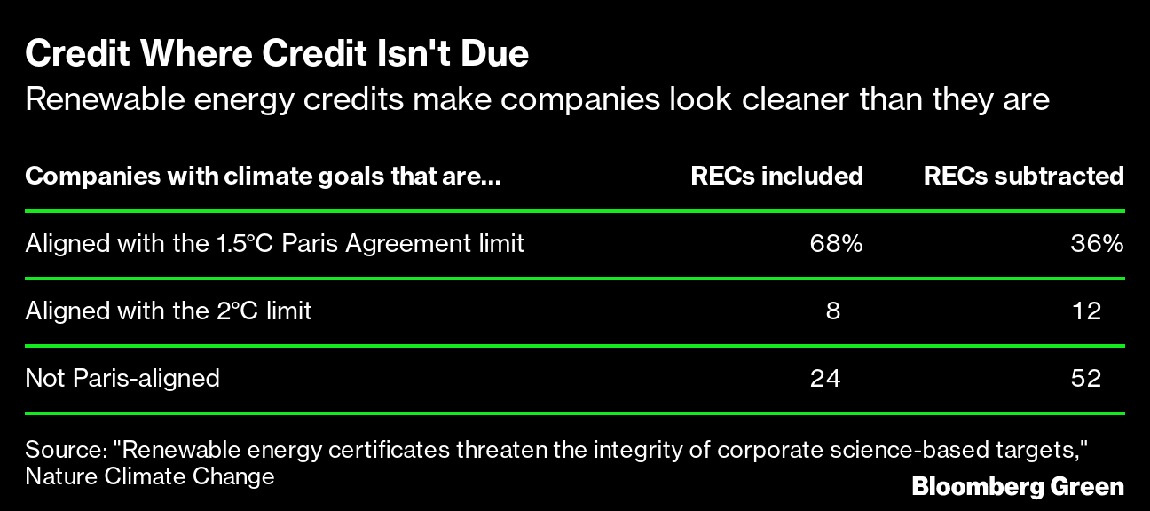 (Bloomberg) -- To neutralize their carbon dioxide emissions, many companies buy certificates from clean power providers, called renewable energy credits, allowing them to claim they’re using carbon-free power. A new analysis finds that when those credits — which have come under heavy scrutiny — are removed from companies’ carbon accounting, many businesses are no longer on track for meeting climate goals pegged to the Paris Agreement’s aims of limiting global warming to 1.5° or 2° Celsius.