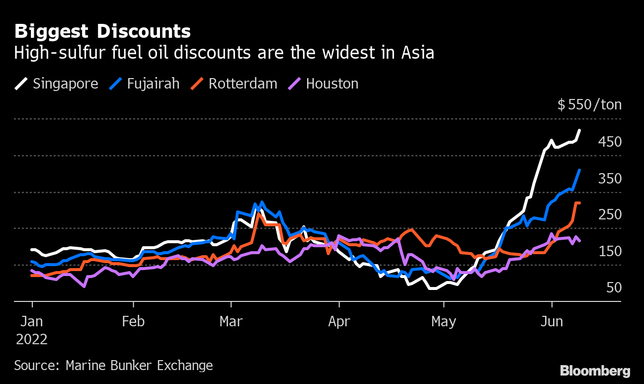 Owners of vessels who installed so-called scrubbers are buying high-sulfur fuel oil at a discount of more than $500 a ton in Asia compared with cleaner varieties. The collapse in HSFO prices has been partially driven by increased Russian flows, according to traders. The cost of very-low sulfur fuel oil, meanwhile, has surged as more of its feedstock gets refined into gasoline.
