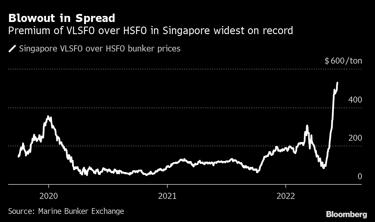 The blow-out in the difference between the two varieties of shipping fuel is being caused by US and European restrictions on Russian HSFO following the invasion of Ukraine, which is seeing more of the fuel exported to Asia and the Middle East. Refineries are also maximizing production of gasoline due to soaring prices, at the expense of VLSFO.