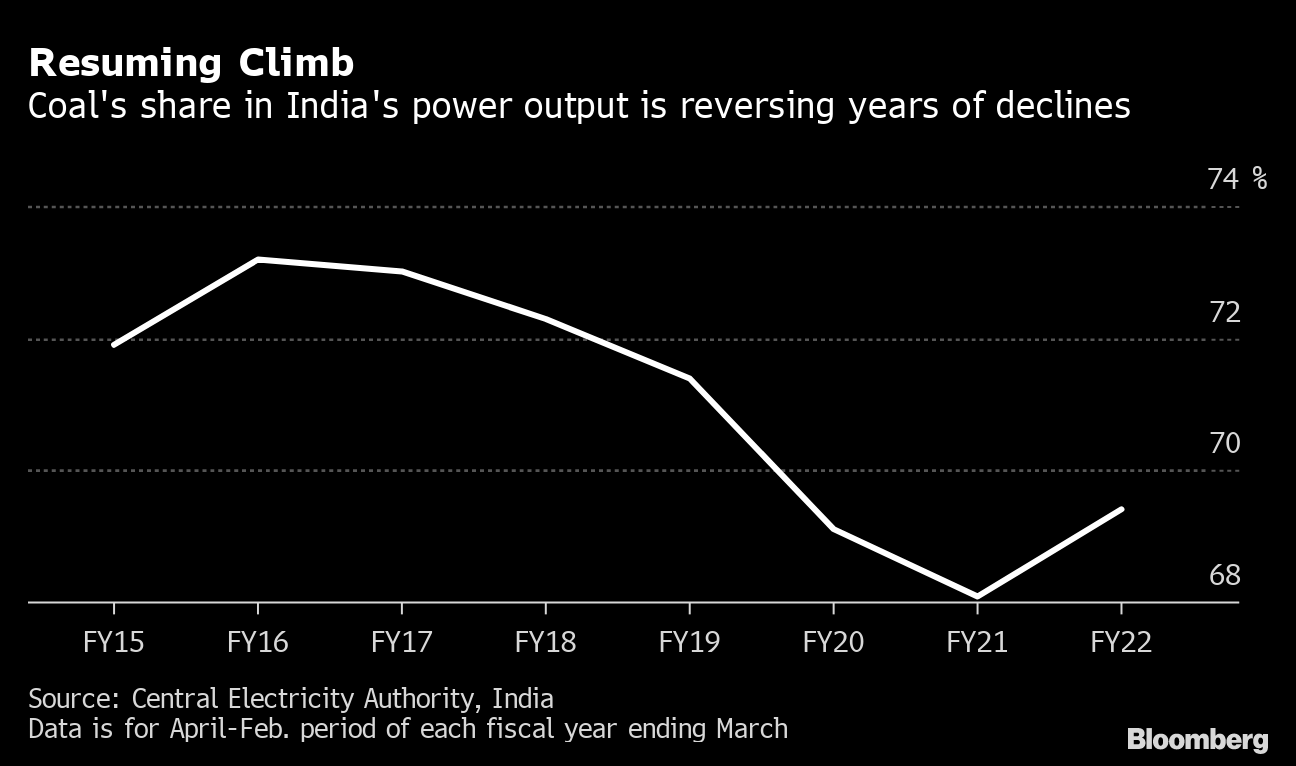 The fuel contributed 69% of the country’s total electricity generation in the first 11 months of the fiscal year to March, compared with about 68% a year earlier, Bloomberg calculations based on data from the Central Electricity Authority show. Power output from the fuel was at a record during the 11-month period, rising more than 10% over the year.
