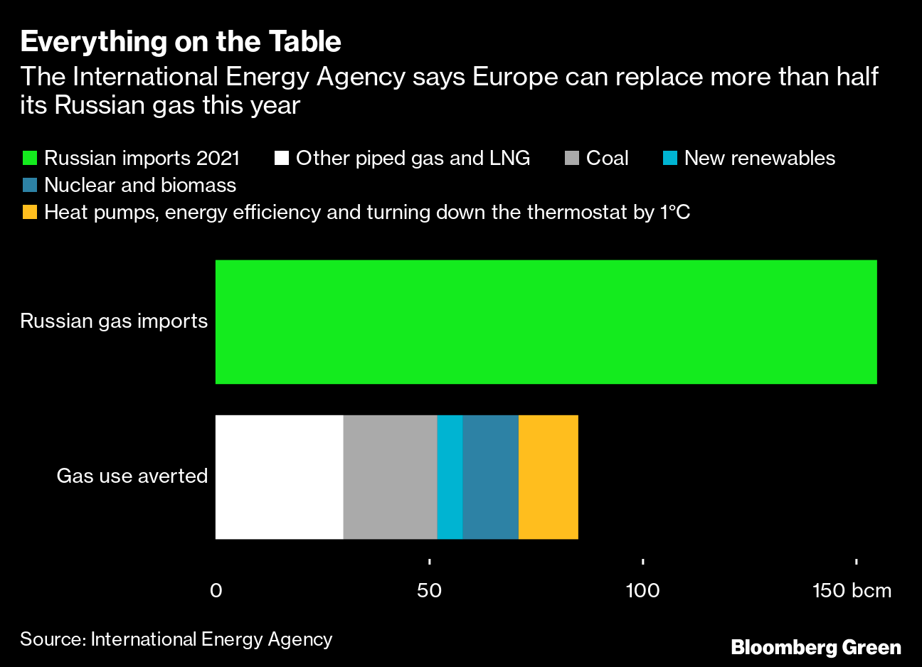 It’s possible, based on IEA estimates, for Europe to cut Russian gas imports by a third or even by half by next winter. That will require more piped gas from Azerbaijan, Norway and Algeria while also buying more shipments of liquefied natural gas and fixing leaky pipeline infrastructure. The last step would also help stem methane emissions, a major source of global warming.