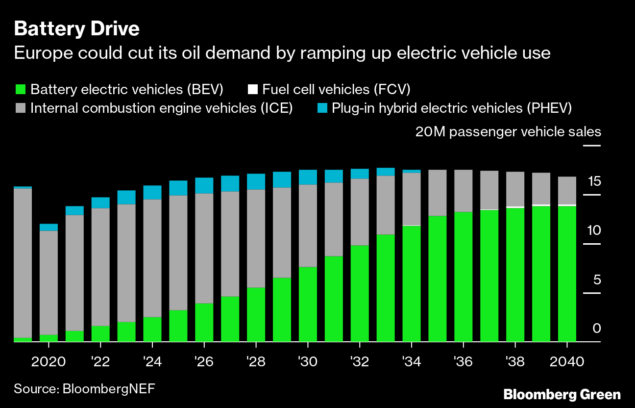 Electrifying transportation more quickly might not help in the moment but can permanently reduce oil consumption in the longer term. Even without any additional policies, the clean-energy researchers at BloombergNEF expect electric vehicle sales in Europe to quadruple by 2030. If policymakers pour money into the industry in response to the Russian invasion, that rate could increase significantly. In Norway, for example, EVs now make up 15% of cars on the road thanks to strong incentives; the country’s oil demand has dropped by 10% from 2011 levels.