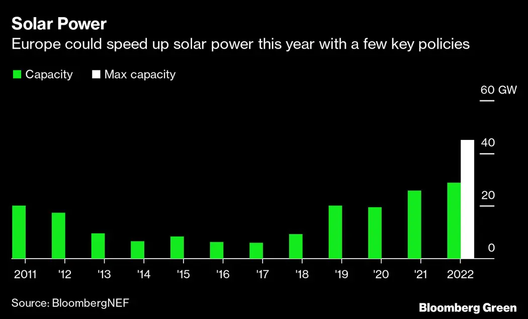 Of all the green solutions available, solar is the easiest to speed up. Panels are relatively easy to install, and rooftops all over Europe sit empty. Demand has alreadysurged in recent weeks as companies try to offset sky-high gas and power prices. The region could boost deployment by as much as 50% this year just by making approvals more efficient, according to Jenny Chase, head of solar analysis at BloombergNEF.
