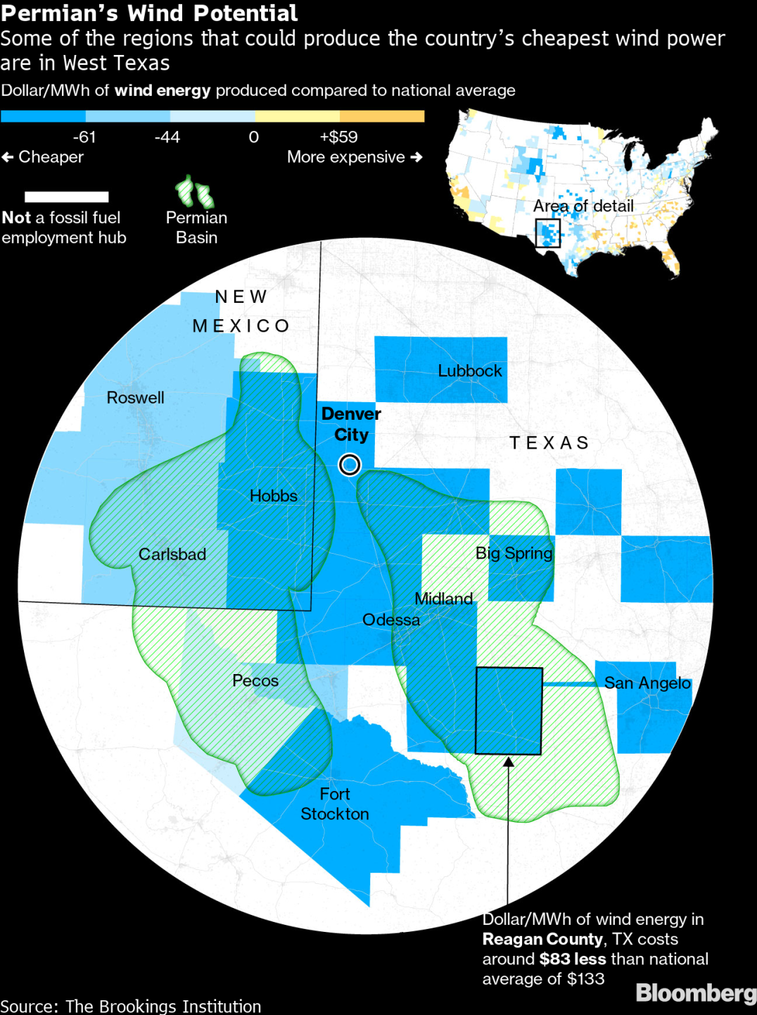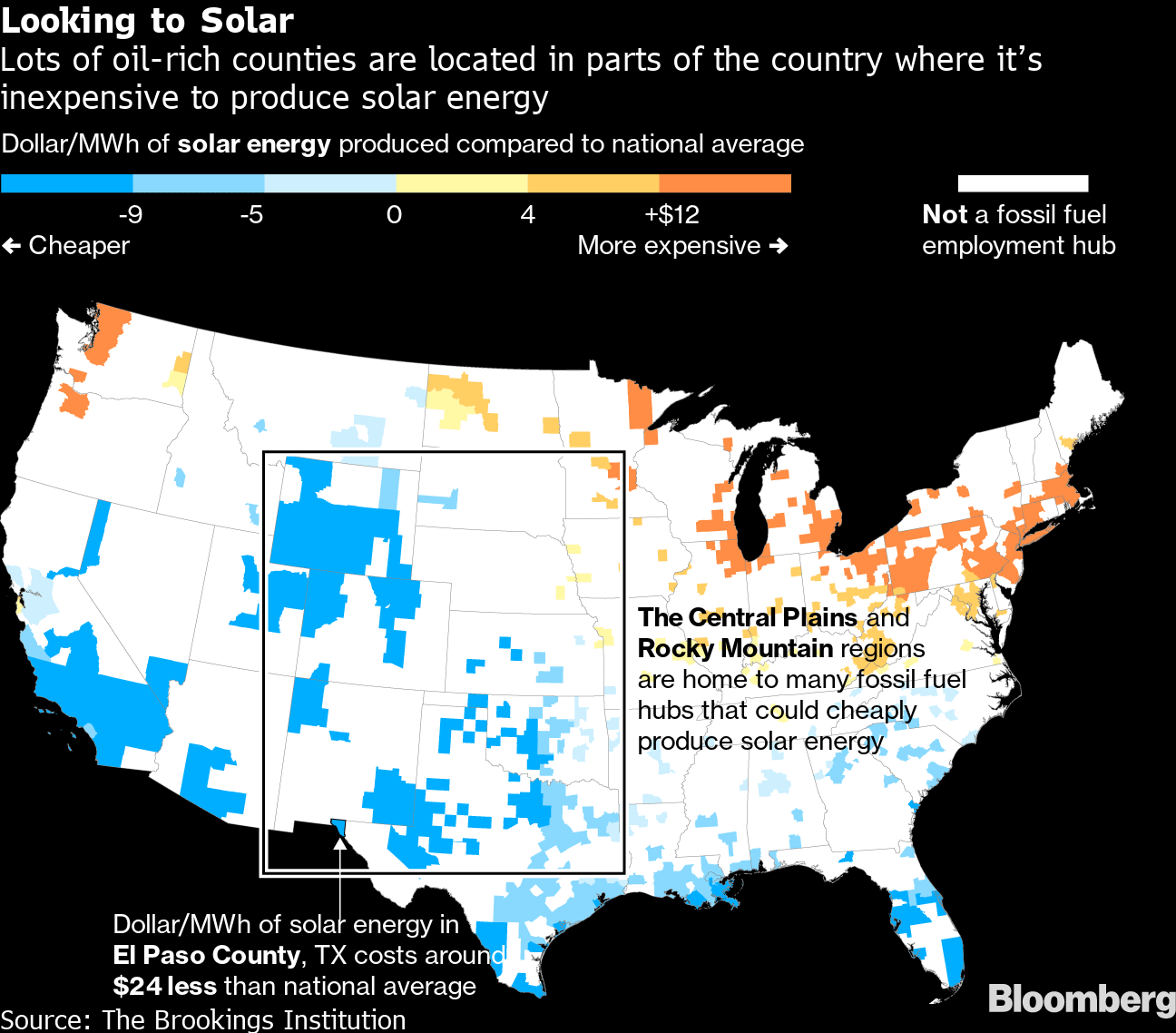 Geographic analysis conducted by the Brookings Institution found that a quarter of the counties in the U.S. with the greatest potential for both wind and solar electricity generation are also fossil-fuel hubs. Some of the regions that could produce the country’s cheapest wind power, for example, are in West Texas.