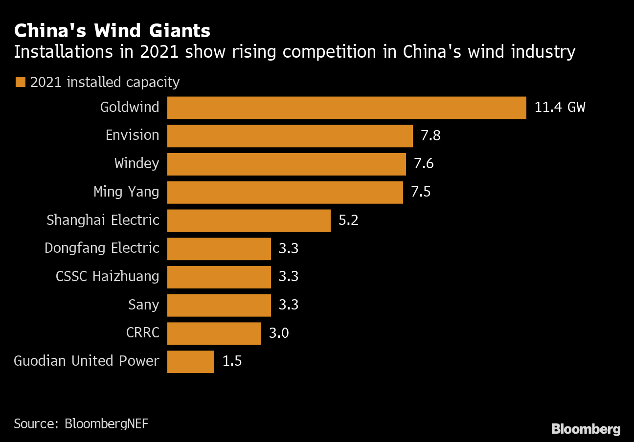 State-owned Zhejiang Windey Co. doubled its installations in 2021 to become one of China’s key suppliers, the BNEF data shows. Government-backed producers have been lifting their share of the turbine market in recent years, as President Xi Jinping sets out policies aimed at boosting clean energy and curbing emissions.