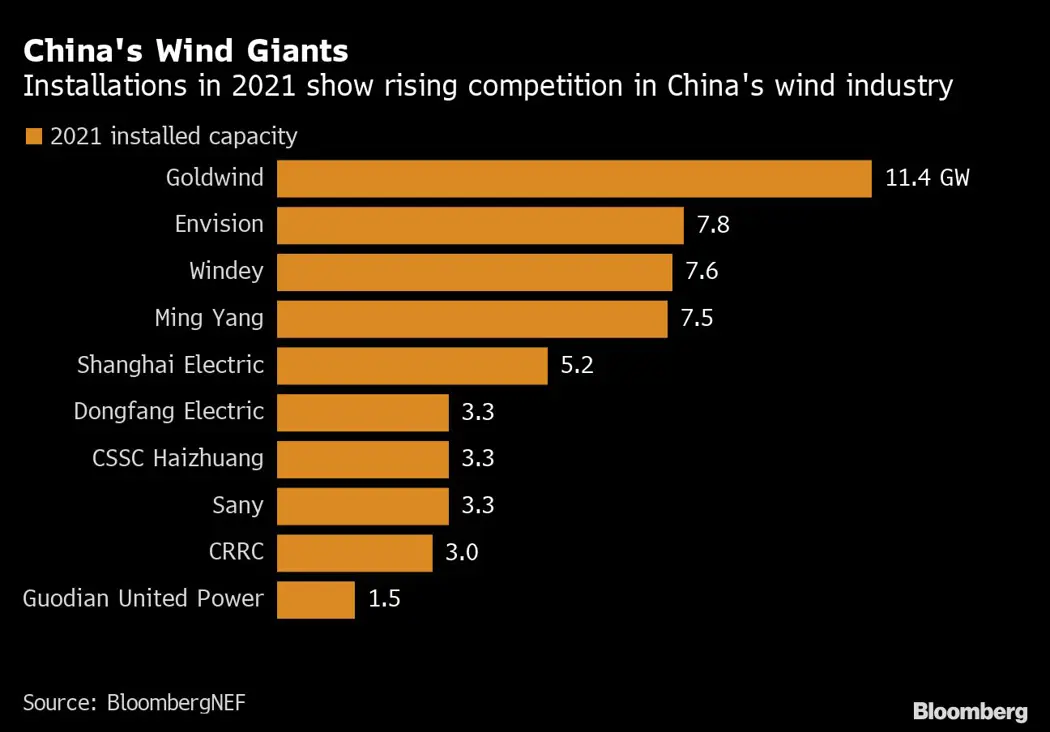 (Bloomberg) -- China’s top wind turbine producers are facing a growing challenge in the world’s largest market, as smaller players increase sales and with fierce competition on pricing.