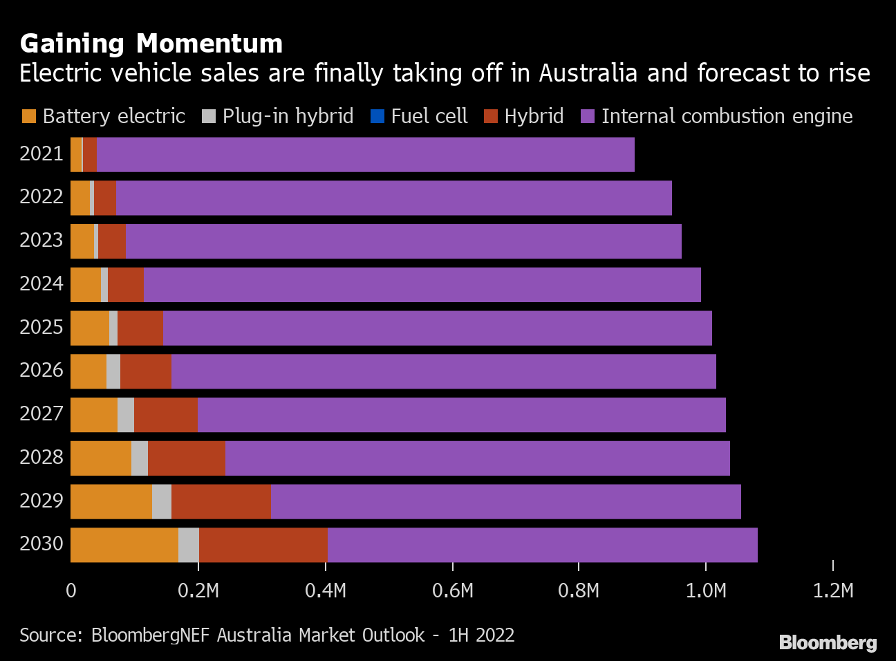 Still, plug-in vehicles make up only 2% of all new-car sales in Australia, industry data show. That’s way behind a global average of 13% in the final three months of 2021, and a tiny fraction of the market share in leading adopters like China, Norway and Sweden.