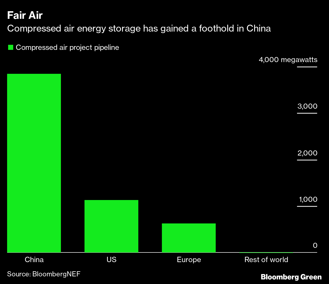 Underground compressed air is considered one of the least costly forms of long-term energy storage and has low safety concerns, according to BloombergNEF. But its reliance on certain topographical features such as underground caverns may limit wider deployment. It’s gained a foothold in China, with nearly four gigawatts of projects in the pipeline, while there are less than two gigawatts combined planned in the rest of the world. Shandong province said just this week in this year's work plan that it would build three projects using the technology.