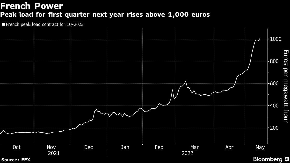 French peakload prices, from 7 a.m. to 7 p.m., for first quarter next year jumped above 1,000 euros ($1,037) per megawatt-hour on the European Energy Exchange AG, almost three times as high as in Germany. The French baseload contract for same period is about double the price in Germany or Italy.