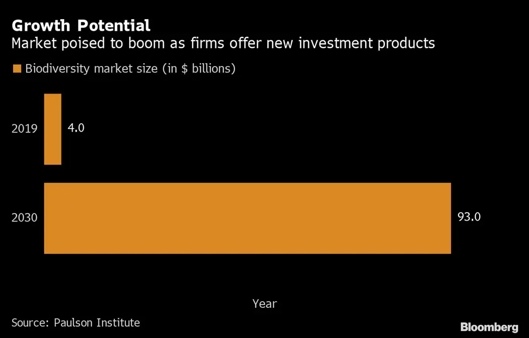 The Paulson Institute estimates the market for biodiversity investments could reach as much as $93 billion by 2030, up from about $4 billion in 2019. That would follow a similar trajectory of other environmentally labeled products like green bonds, which had sales of more than $500 billion last year, little more than a decade after the first one was issued.