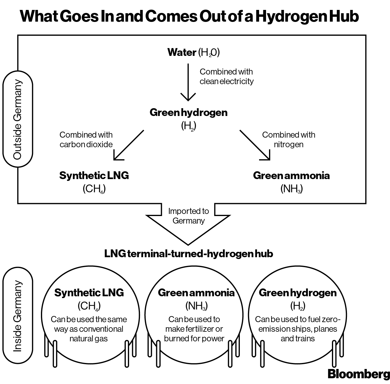 That’s why most of the planned LNG terminals in Germany are proposing a third option in the interim: importing a fuel known as synthetic LNG. To make it, hydrogen is combined with carbon dioxide — either captured from factory smokestacks or created as bio-waste decomposes — to form methane, giving it an identical chemical composition to natural gas.