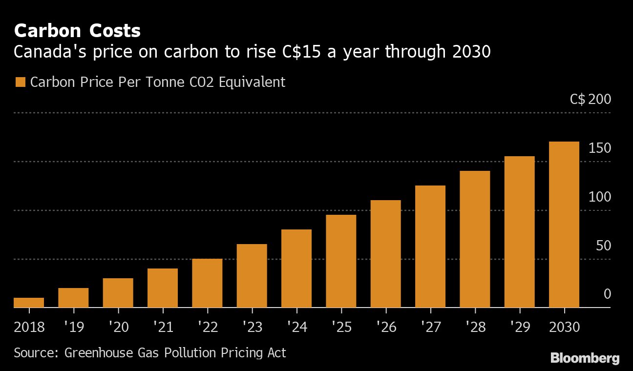 Companies including Shell Plc, oil sands producer Canadian Natural Resources Ltd. and Edmonton, Alberta-based power generator Capital Power Corp. use environmental credits to cover obligations under an Alberta emissions charge. The charge is set to rise to C$170 a metric ton by 2030, from C$50 a ton this year, in accordance with guidelines by Canada’s federal government.