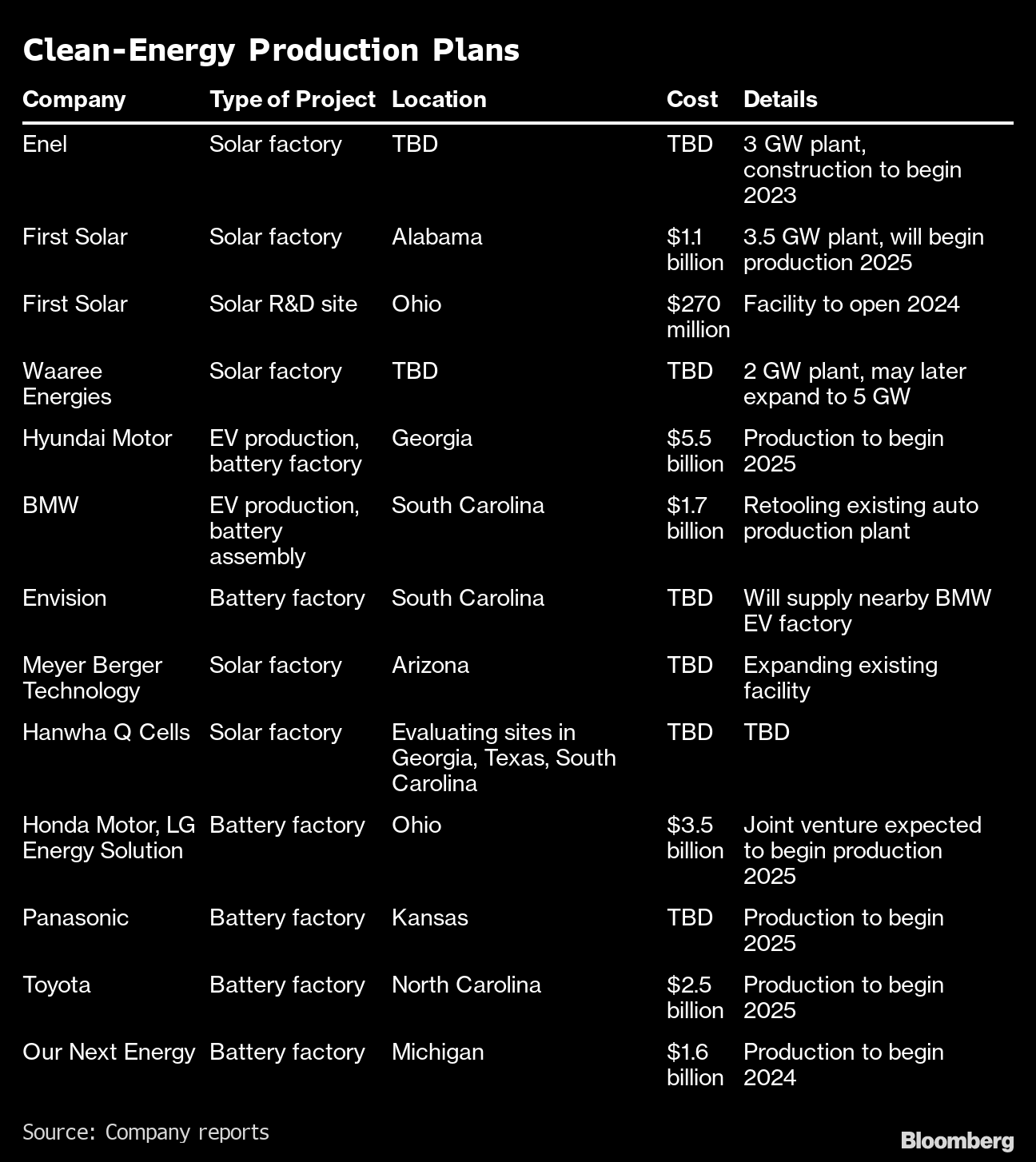 (Bloomberg) -- Three months after President Joe Biden signed a sweeping climate law, several cleantech companies have moved forward with new US manufacturing factories that will cost at least $16.2 billion, according to data compiled by Bloomberg.