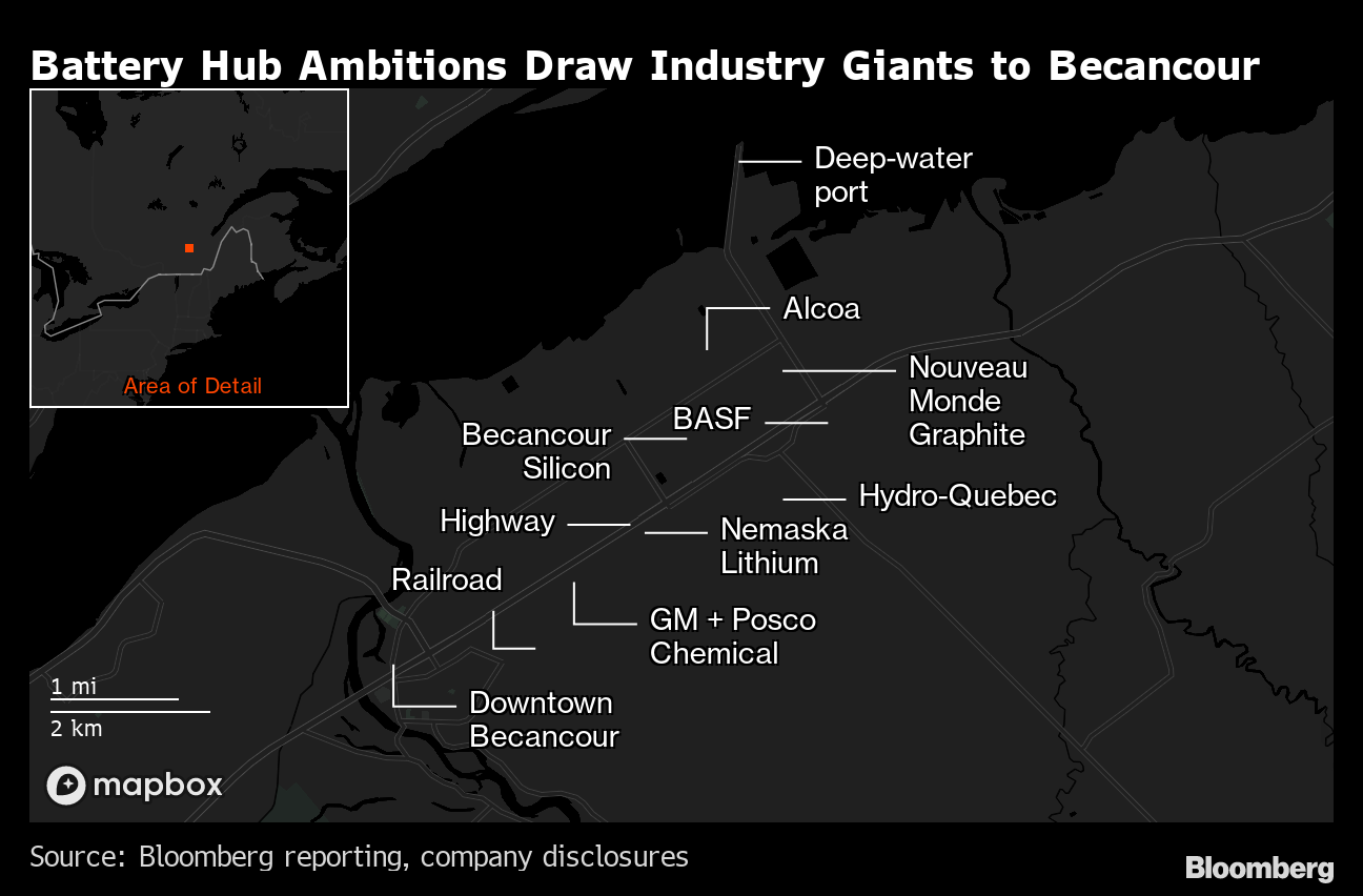 The federal and provincial government -- which both have strategies to expand development of critical minerals and supply chains -- are keen to make Quebec a North American supplier of EV battery components. Quebec’s investment alone in Becancour could reach C$3 billion, Economy Minister Pierre Fitzgibbon said. He’s been at the heart of discussions around the area’s development and expects to announce two to three more projects in the coming months. Still, he recognizes this small city has limits.