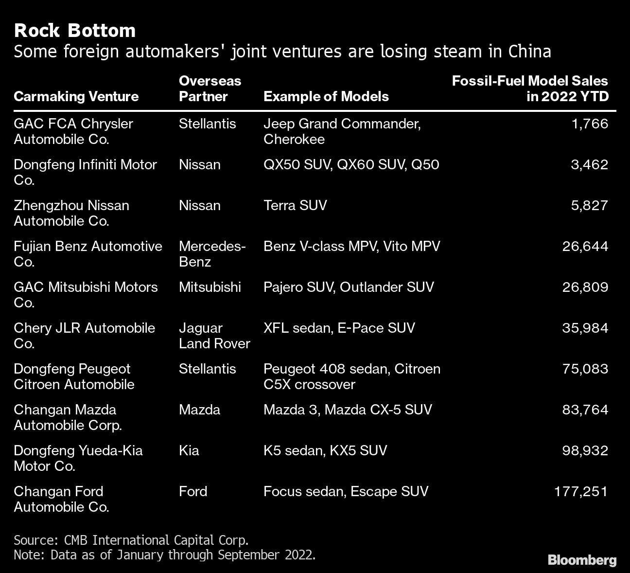 Among the joint ventures of major international players, the following 10 are at the bottom, ranking worst in terms of combustion-engine sales, according to CMB International Capital Corp. and using data from the China Association of Automobile Manufacturers.