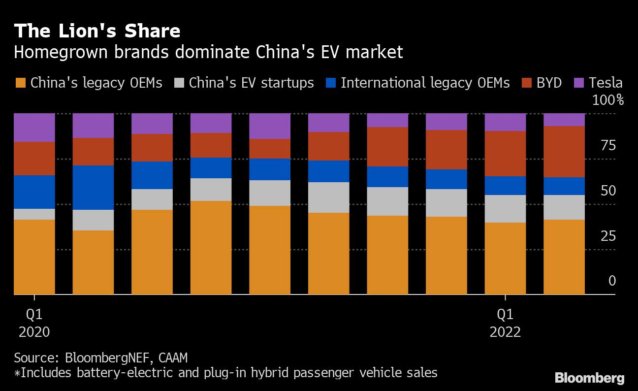 Buyers in China are instead increasingly plumping for local EV brands that have competitive pricing, snazzy designs, and smart features such as in-car entertainment and autonomous driving. Homegrown marques — led by BYD Co. — accounted for almost 80% of EV sales in the first seven months of 2022, according to China’s Passenger Car Association.