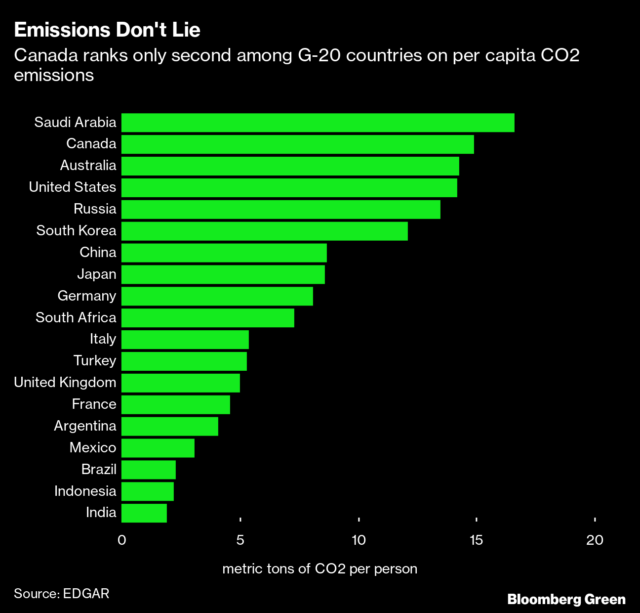 In the seven years since Trudeau took office, emissions have plateaued while Canada’s economy has grown 8%. A cleaner electric grid coexists with even more extraction and burning of oil. But all of Canada’s peers in the Group of Seven, or G-7, have managed to achieve economic growth while simultaneously cutting emissions, and Canada’s environmental commissioner says the country is struggling to bend the emissions curve. Among the Group of 20 major economies, or G-20, Canada ranks behind only Saudi Arabia when it comes to per capita emissions, and ahead of Australia.