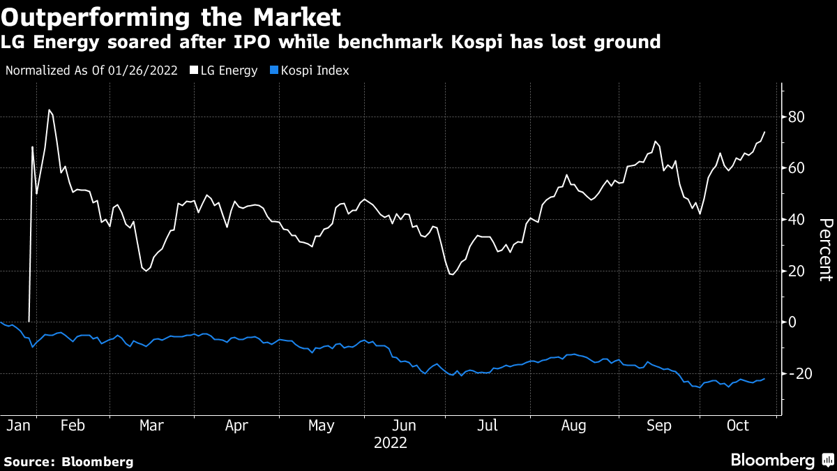 LG Energy shares were up 2.2% as of 11:25 a.m. in Seoul. The shares have advanced 74% since listing in January in South Korea’s biggest-ever initial public offering.
