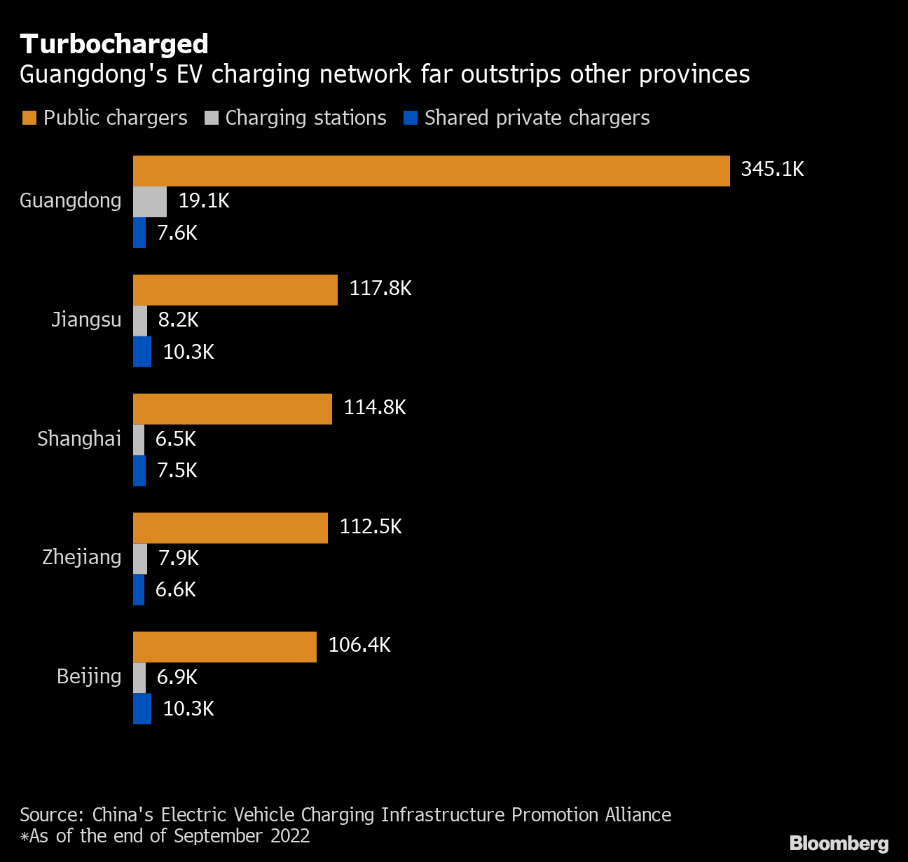 The coastal region, which borders Hong Kong, has built hundreds of thousands of public charging points — the EV equivalent of gas pumps — over the past few years. With 345,126 public chargers and 19,116 charging stations as of the end of September, Guangdong has the largest EV charging network in China, one that has more than doubled from a year ago, according to the China Electric Vehicle Charging Infrastructure Promotion Alliance. That’s around three times as many public chargers in the whole of the US, according to BloombergNEF data.