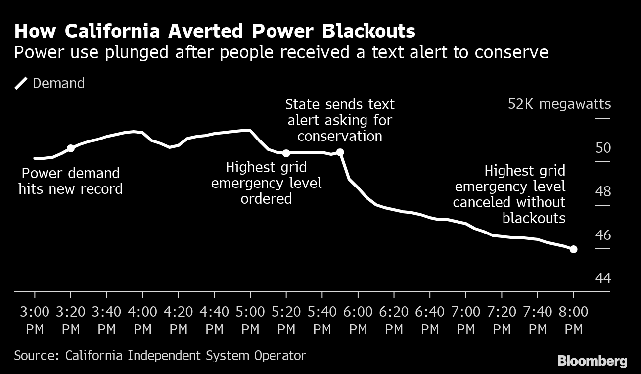 (Bloomberg) -- A timely mobile alert may have prevented hundreds of thousands of Californians from being plunged into darkness in the middle of a heat wave Tuesday night.