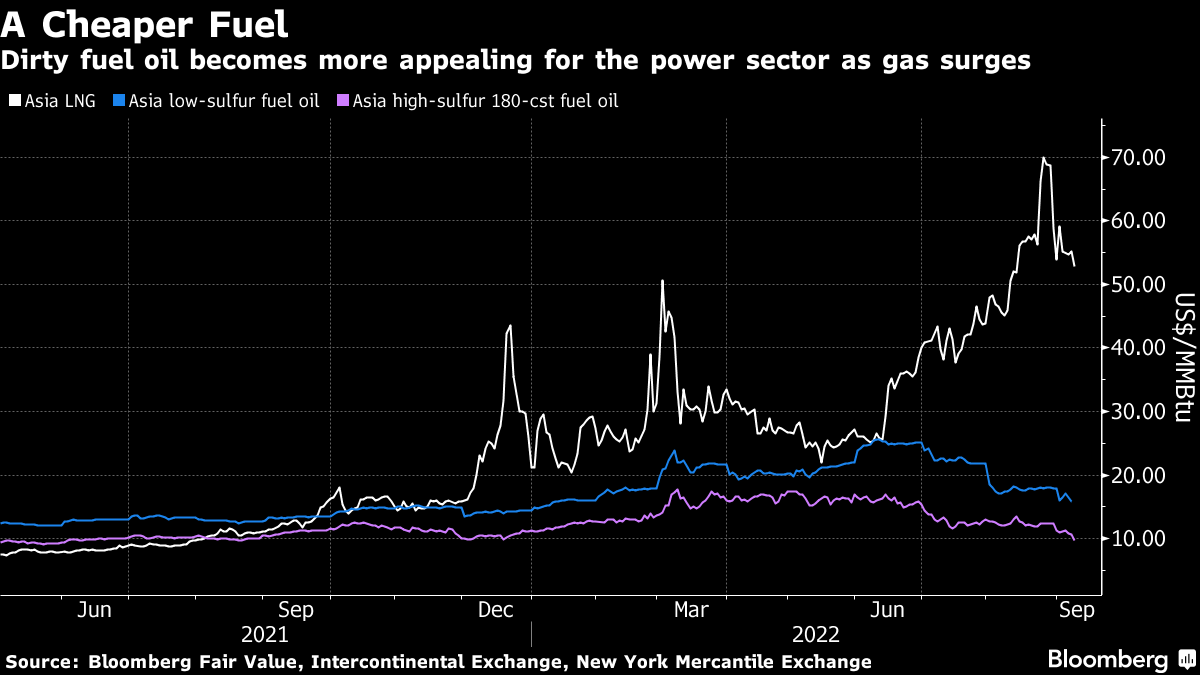 (Bloomberg) -- Asia is stocking up on dirty fuel oil for winter power generation earlier than usual as a gas shortage sees environmental concerns take a back seat to making sure the lights remain on.