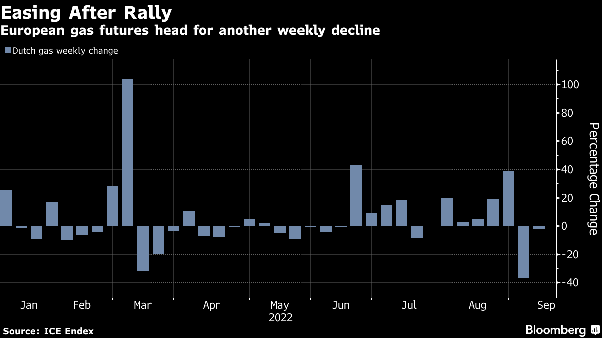 Benchmark Dutch gas futures dropped as much as 9.7% to 199.09 euros per megawatt-hour after EU ministers agreed the bloc’s executive arm should take steps to intervene to ease the crisis. Prices have been extremely volatile recently, posting the biggest weekly drop on record just seven days ago. Still, they’re about eight times higher than normal for this time of year.
