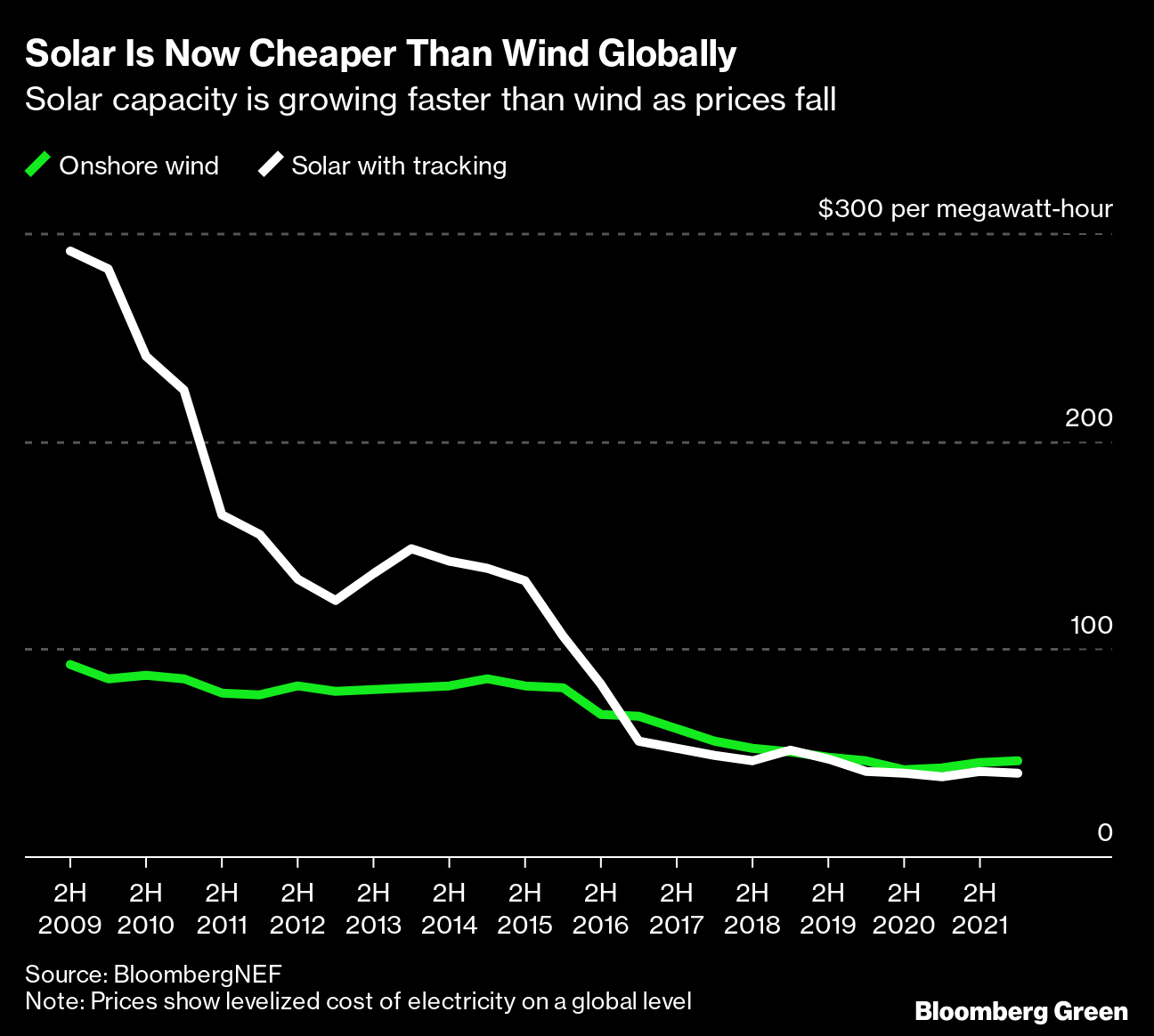 “Wind used to be much cheaper than solar, but solar caught up and in fact is even cheaper now in most sunny countries,” said Jenny Chase, BNEF’s lead solar analyst. “Plus you can build solar in more places.”