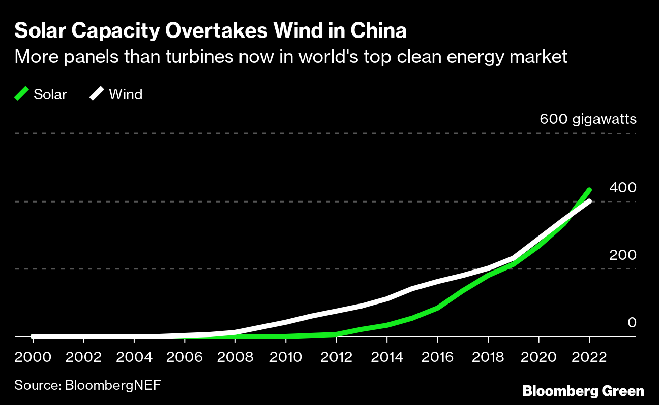 China’s solar capacity rose 1.9% to 349.9 gigawatts in August, surpassing wind, which grew by just 0.2% to 344.5 gigawatts, according to National Energy Administration data released last week. The country will have more capacity from panels than turbines on an annual basis for the first time by the end of this year, according to BloombergNEF forecasts.