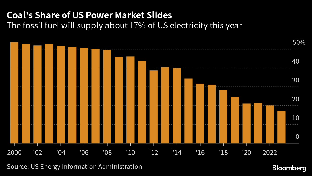 (Bloomberg) -- Coal use in the US power market is set to decline for a second year in succession as utilities increasingly shift to cheaper and cleaner natural gas and renewables.