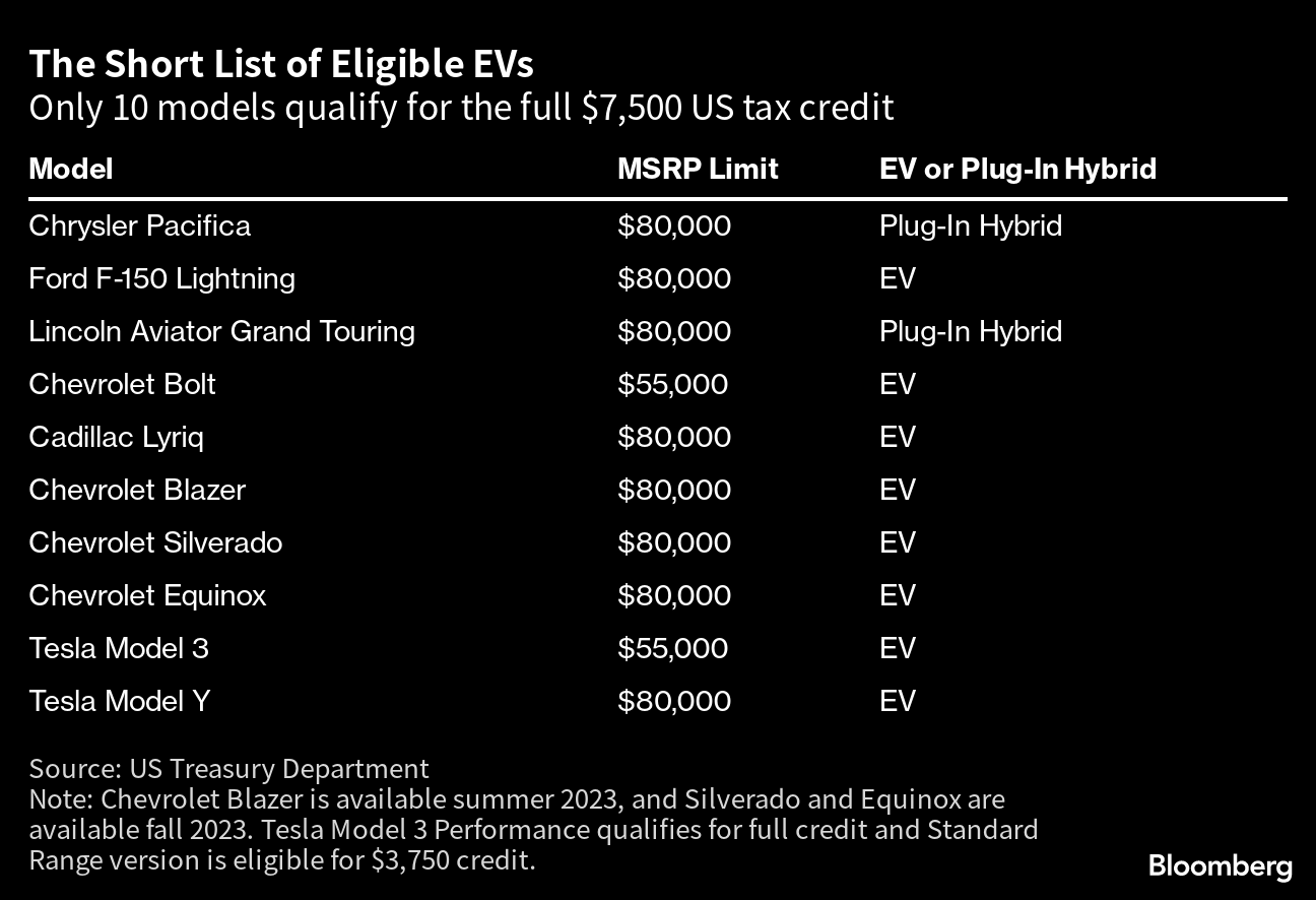 (Bloomberg) -- Only 10 electric and plug-in hybrid vehicles will qualify for $7,500 federal tax credits in the US after stricter battery-sourcing rules take effect and render most plug-in models ineligible.