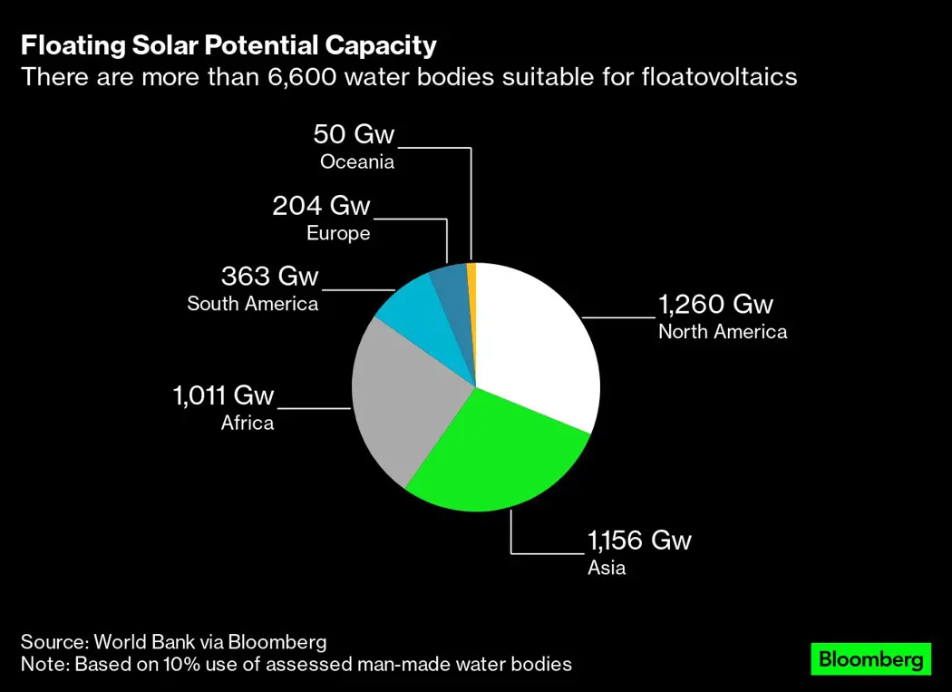 The World Bank figures that Europe could cover at least 7% of its annual power consumption by deploying floating solar panels on just 10% of artificial lake surfaces. If this were scaled globally, the amount of electricity generated would rise to 5,211 terrawatt hours a year — more than all the electricity consumed annually by the US, the world’s largest economy.
