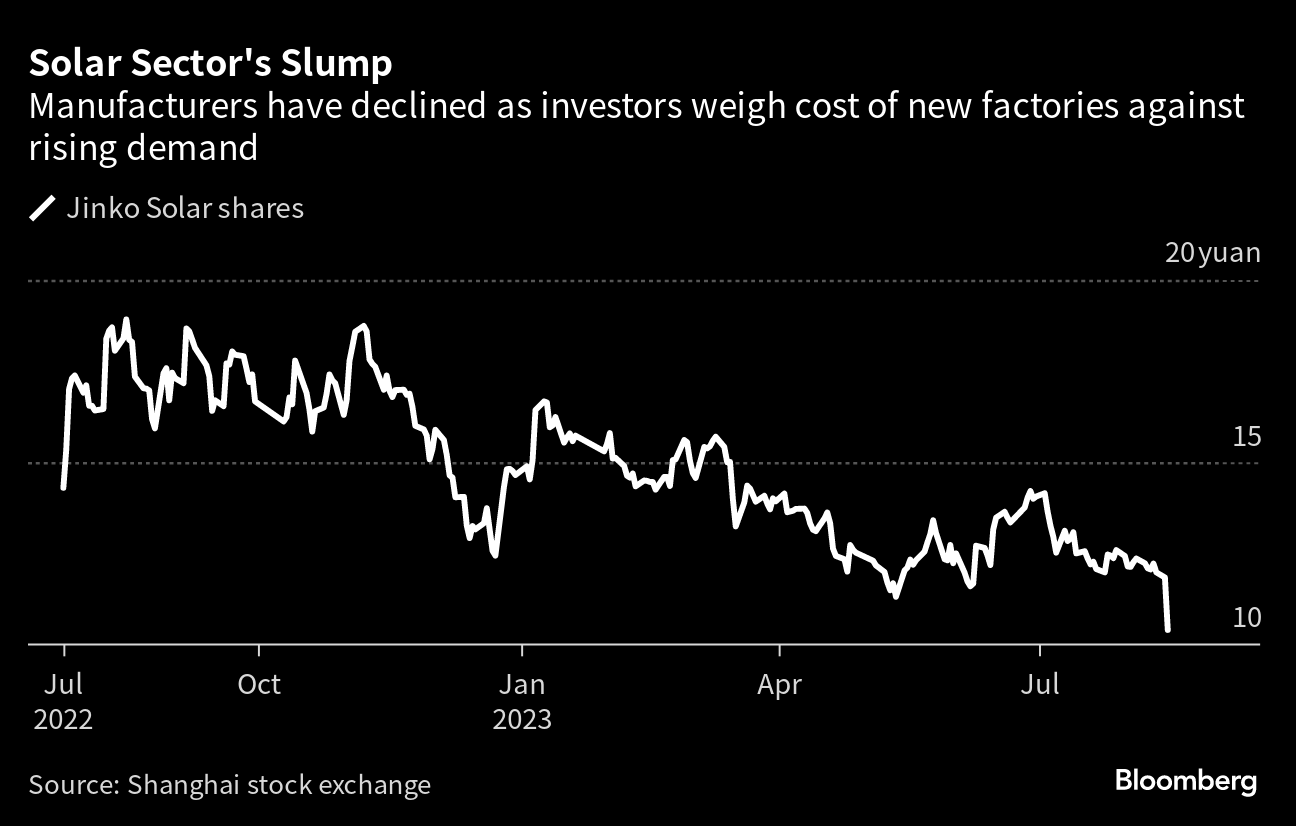 (Bloomberg) -- Jinko Solar Co., one of the world’s largest panel producers, fell as much as 12% after outlining plans to raise 9.7 billion yuan ($1.3 billion) for a manufacturing facility, underlining the sector’s ongoing need for major investments in new plants.