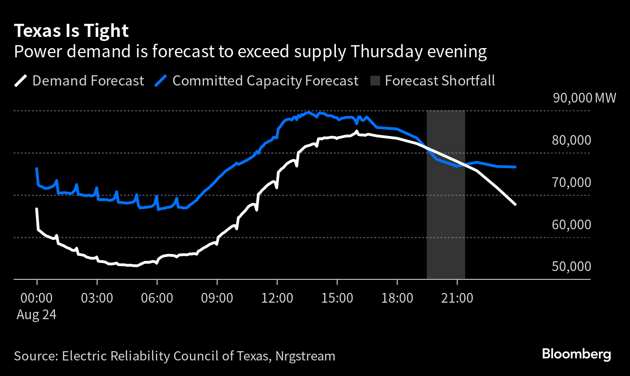 The Electric Reliability Council of Texas anticipates power supplies falling short of demand from about 7 p.m. to 9:30 p.m. local time, according to forecasts compiled by Nrgstream, a data provider. Grid operator Ercot serves 26 million customers in the state and is calling on the public to voluntarily reduce power consumption.