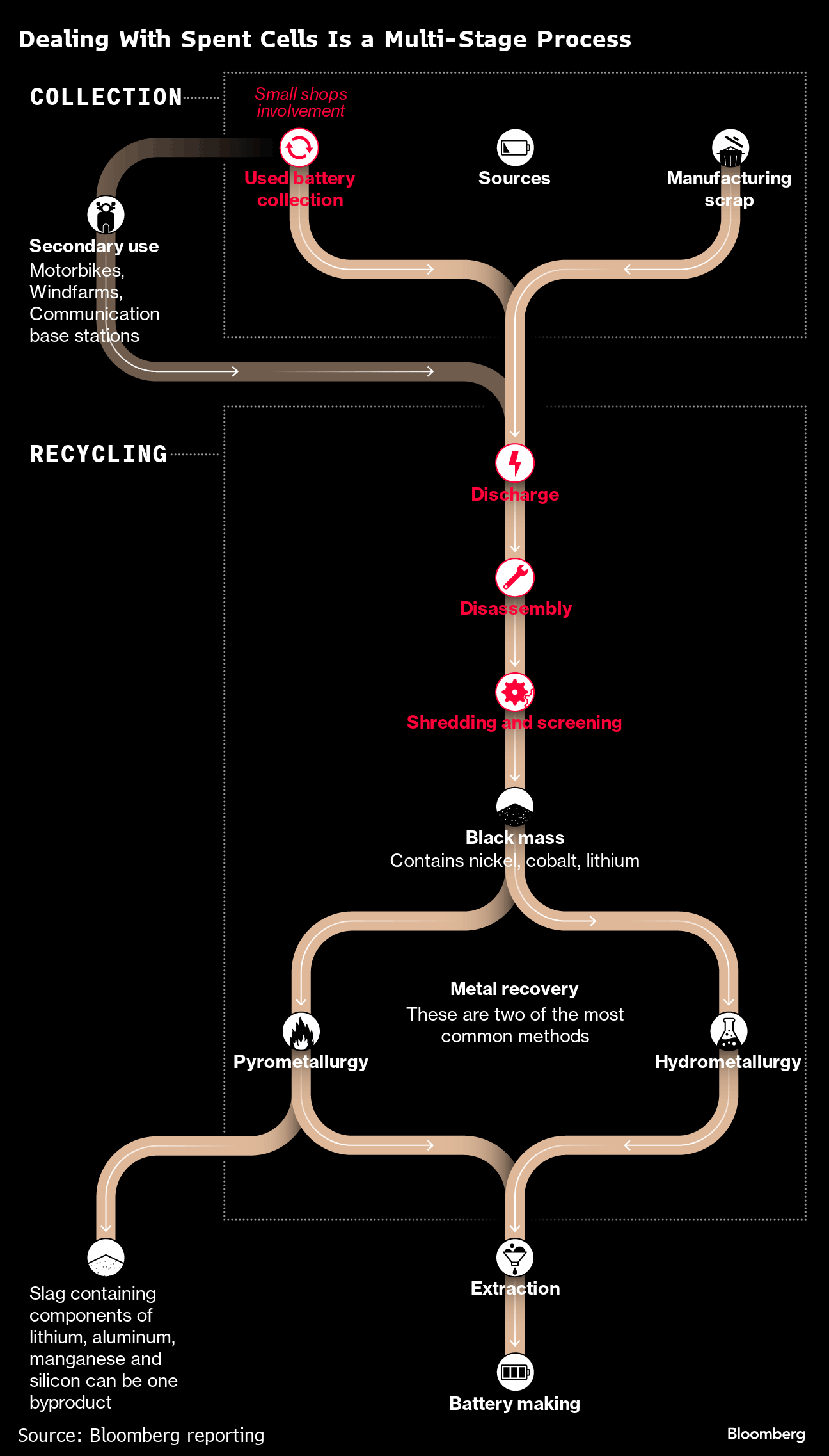 It’s that first step that’s sparked a cottage industry of small-time recyclers in places like Tangxia, a town near the southern Chinese city of Dongguan. Xu Wei, one battery broker Bloomberg spoke to there, said business was thriving until the local government cracked down following a series of accidental fires.