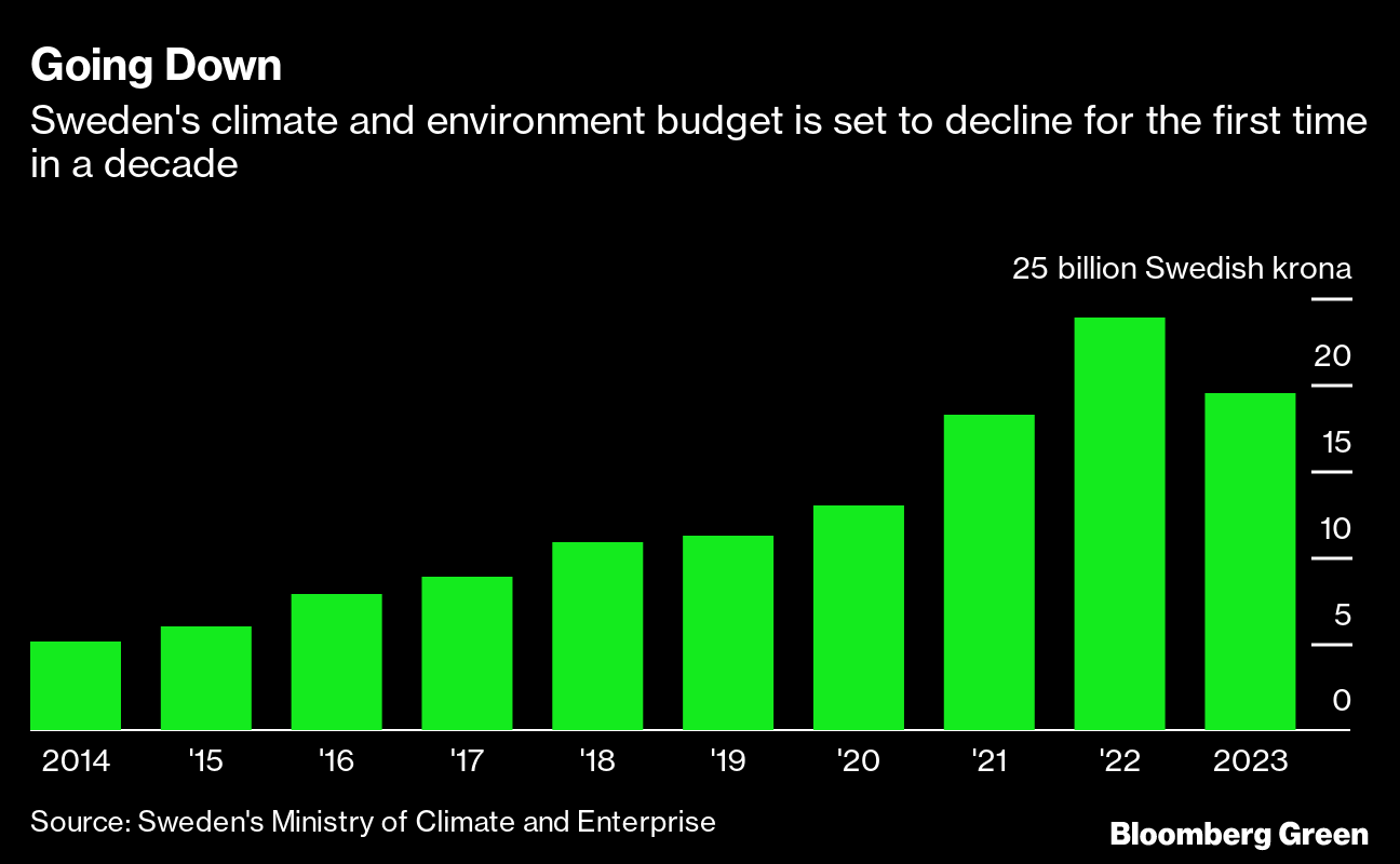 The government’s own climate assessment says its lower environmental spending will lead to increased emissions, and current policy could put Sweden's target for cutting transportation-sector emissions 70% by 2030 out of reach. The environment ministry told Bloomberg that it is working on updating its climate plans through 2025, which it will present later this year. Outside of domestic funding, the new government has committed to doubling its foreign aid to the Global Environment Facility, a multilateral institution that supports climate projects in developing countries.