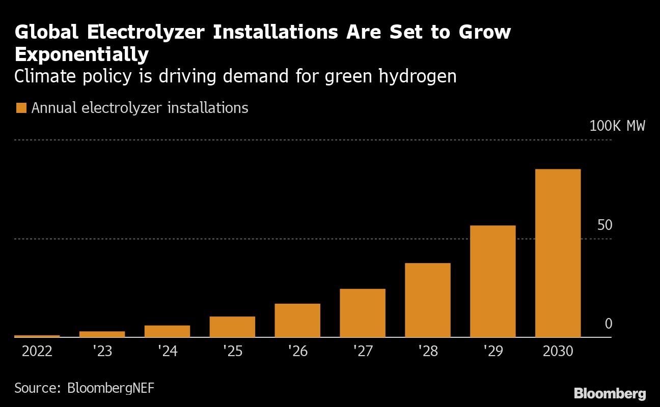 As the world sprints to decarbonize, the next round of competition revolves around a device called an electrolyzer. Plug these into clean electricity such as solar power, and it's possible to extract hydrogen from water without producing any planet-warming emissions. That's a crucial step in creating a green fuel capable of decarbonizing such industries as steel, cement or shipping.