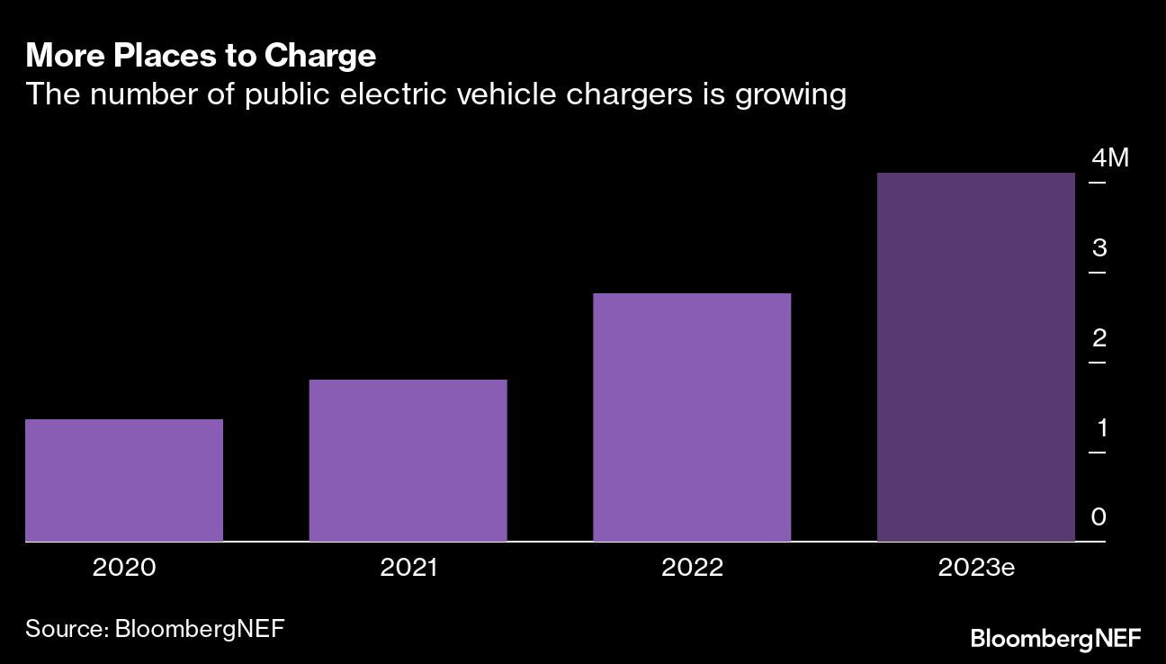 Annual public charging installations more than doubled to just shy of 1 million in 2022, from 450,000 a year earlier. BNEF expects annual installations to reach 1.3 million in 2023, and for the cumulative network to reach 4.1 million.