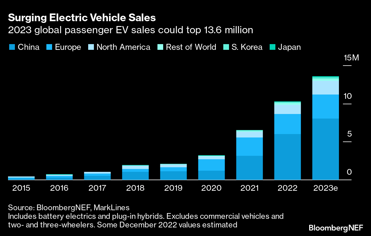 We expect EV adoption to continue to rise in 2023, but at a slightly slower pace than the last two years, which saw sales jump from 3.2 million in 2020 to more than 10 million in 2022. We expect 13.6 million plug-in passenger vehicle sales in total for this year, with around 75% of those being fully electric.