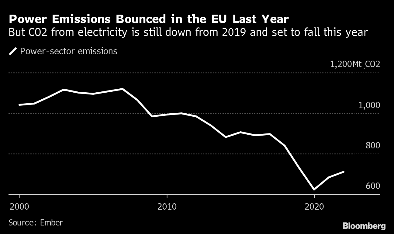 Total fossil generation could drop by 20% this year, with relatively expensive natural gas-fired generation falling the fastest, according to Ember, a UK-based energy think tank. Europe has raced to find alternative energy sources after Russia cut gas flows in the wake of its invasion of Ukraine, sending energy costs soaring. That led to greater reliance on fossil fuels, partially due to a drop in nuclear and hydropower, and contributed to an increase in emissions. Still, solar and wind energy filled in much of the gap, producing a record 22% of the EU’s electricity last year and overtaking gas for the first time.