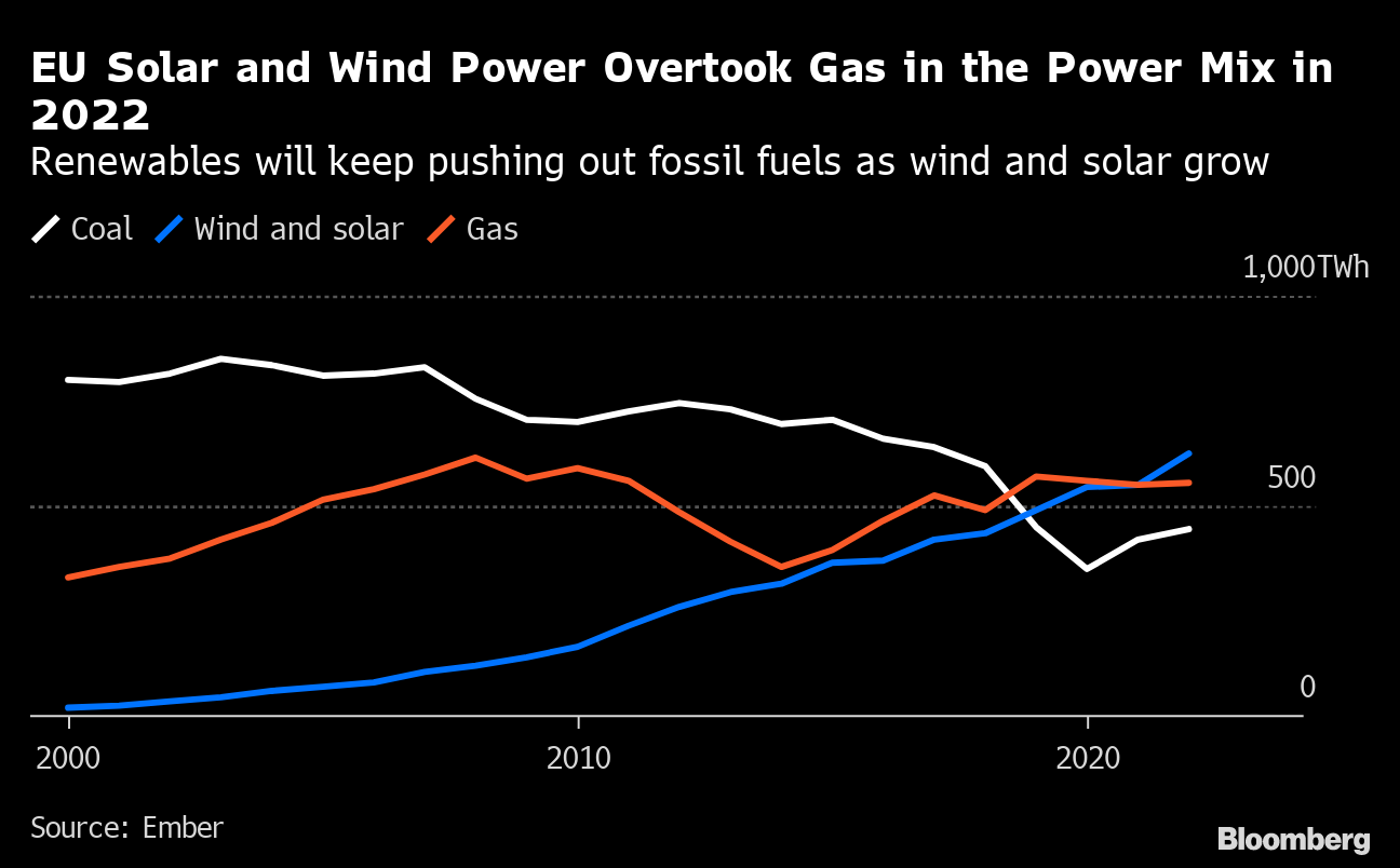 (Bloomberg) -- The amount of electricity produced from burning fossil fuels in the European Union is set to plunge this year as the bloc focuses on renewables to replace energy supplies from Russia.