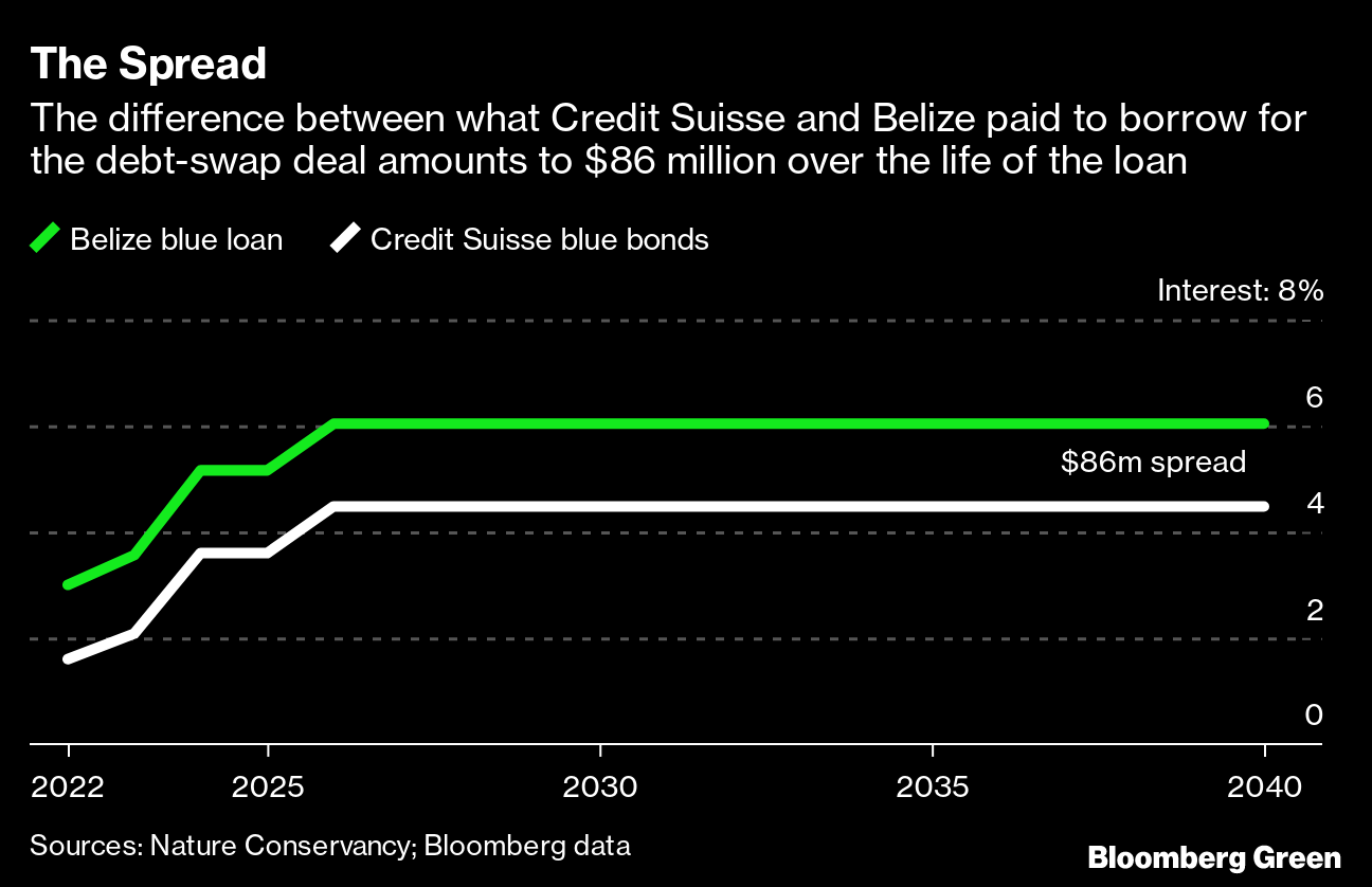 Not everyone is so sanguine. A closer look reveals that Belize’s costs were far higher than the initial $10 million price tag, said UNCTAD’s Munevar, who has studied the transaction. Millions more are hidden in Belize’s interest payments. Munevar compared what Belize pays with what Credit Suisse returns to investors in the new blue bonds. Over the life of the deal, the difference adds up to $84 million, Munevar estimated.