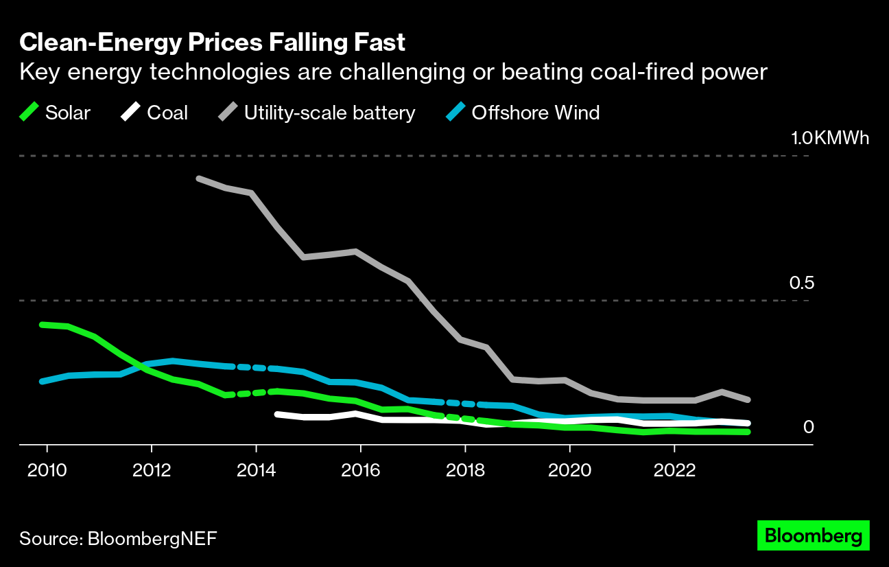 Until the last few years, clean-energy alternatives were too expensive to compete with fossil fuels. Today solar power costs just 11% of what it did in 2009. Offshore wind and battery prices fell 74% and 84%, respectively, from 2012 to 2022, BloombergNEF data shows.