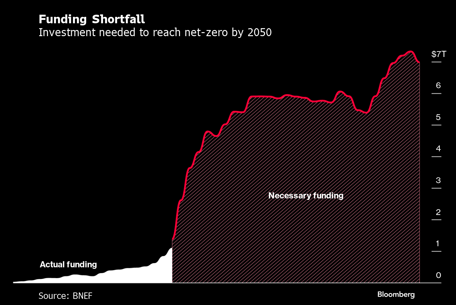 The sums needed to virtually eliminate global emissions by mid-century, which would give the world a chance of staying within 1.5C of warming, are head-spinning: $196 trillion in total spending, according to BloombergNEF, or almost double the size of the global economy in 2022.