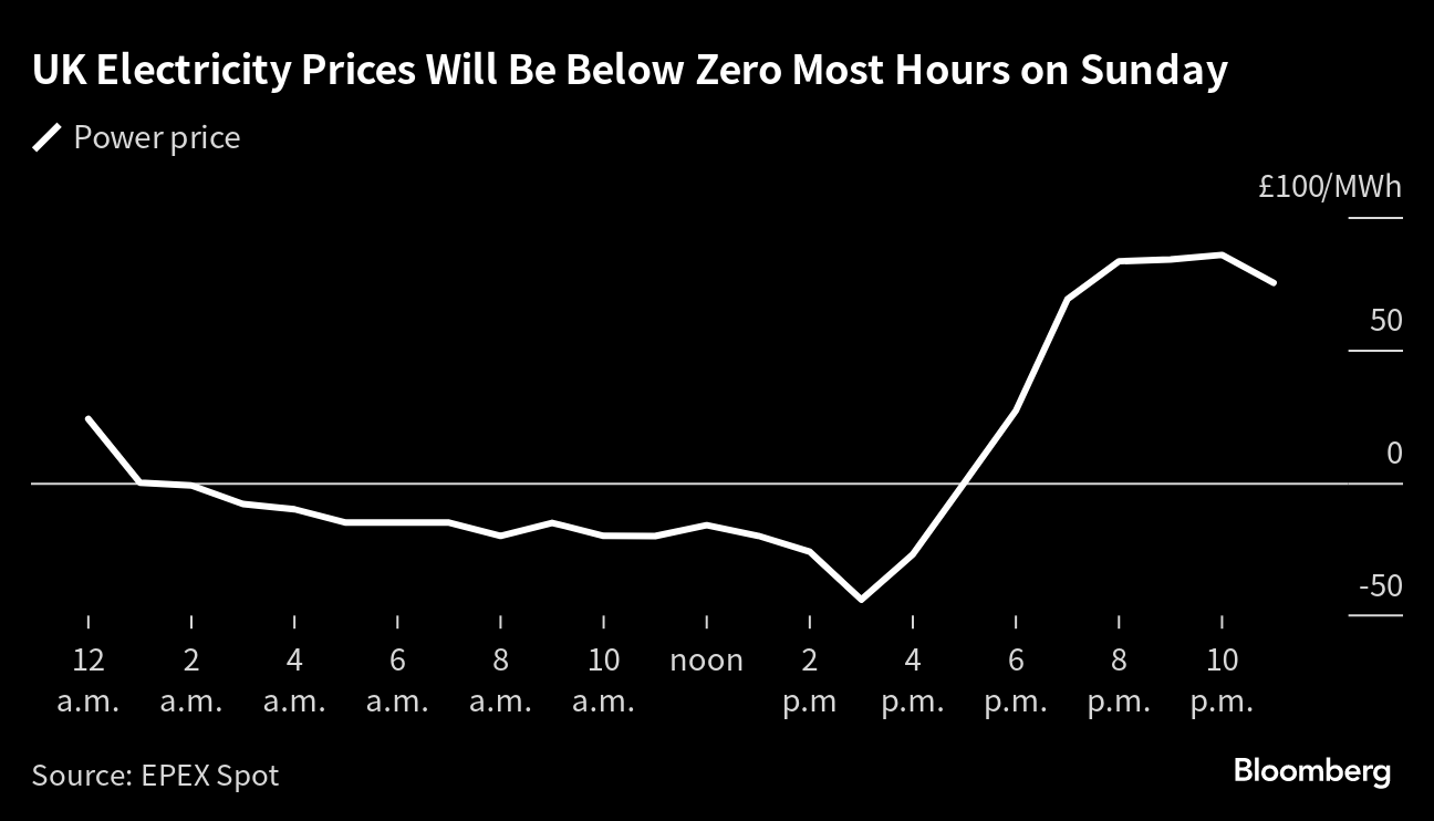 Data from Epex Spot SE on Saturday show electricity prices for much of Sunday are negative in nearly a dozen countries including the UK, Germany, the Netherlands and France. That’s the second day in a row of widespread negative prices after power dropped below zero in the middle of the day Saturday in those countries as well. In the Netherlands, the price is set to be as low as -€73.76 per megawatt hour Sunday afternoon.
