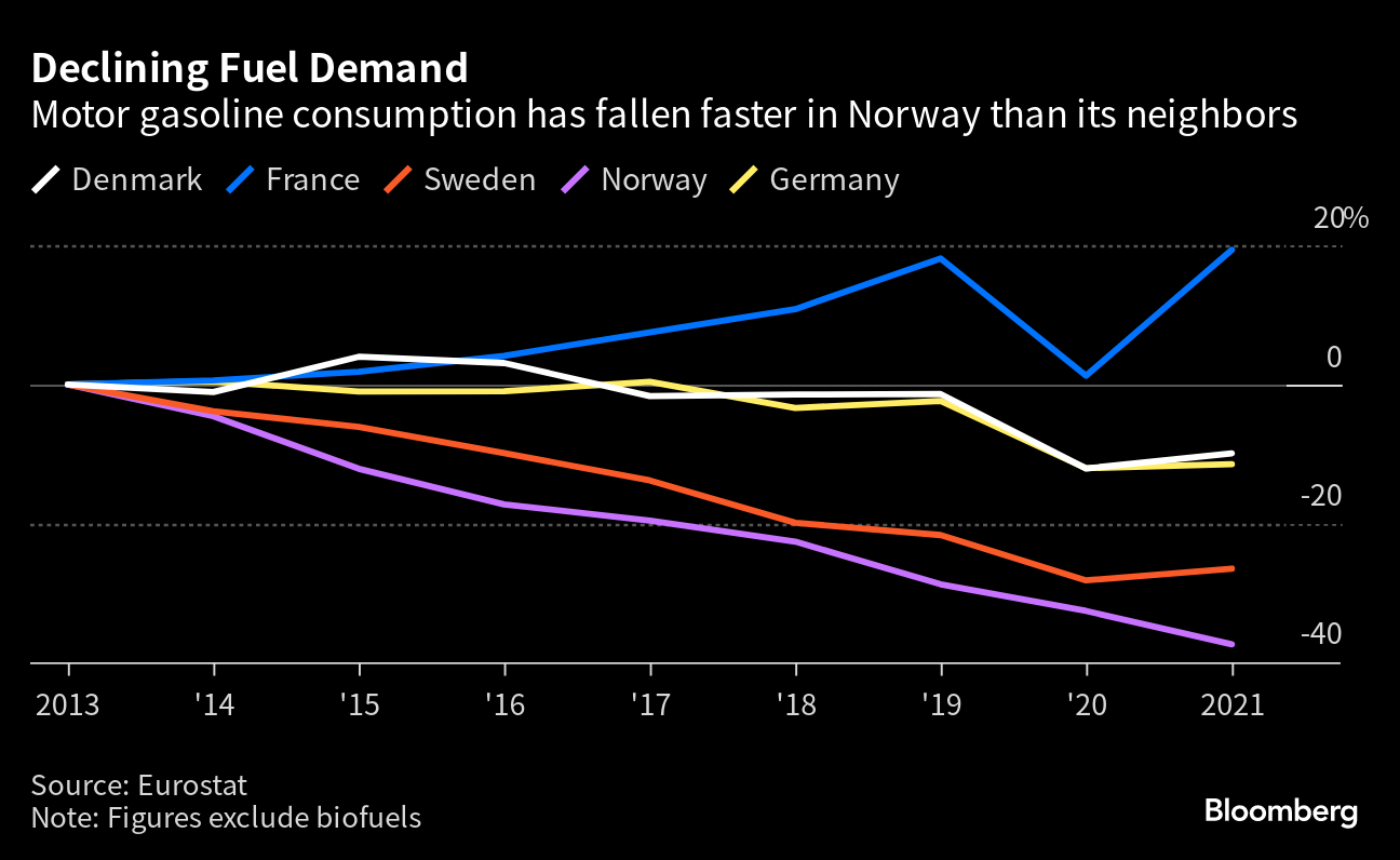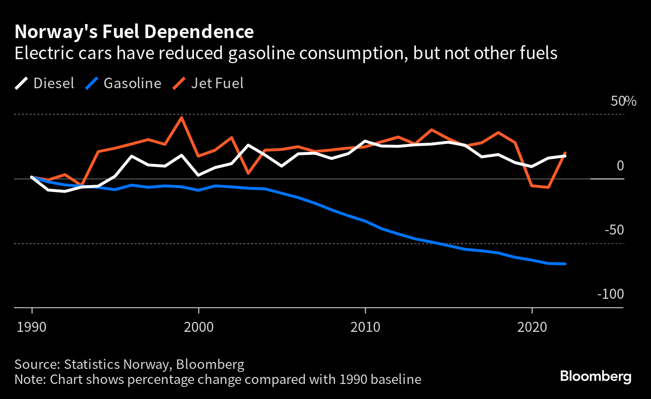 “In Norway, the sale of new electric cars has gone from 3% in 2012, to almost 80% in 2022,” Christina Bu, the secretary general for the Norwegian Electric Vehicle Association, said in an interview. “I think the rest of the world must learn from this and realize that this change is going to happen.”Norway’s experience shows a potential downward trajectory for global fuel demand. Yet it also highlights the limitations of electric cars when it comes to curbing overall consumption of fossil fuels and achieving net-zero emissions.