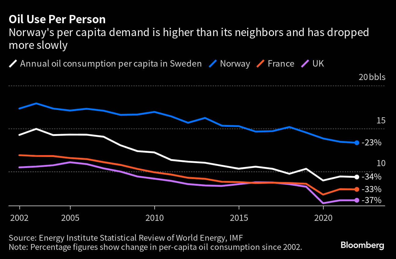 Norway’s oil consumption per capita has fallen by almost a quarter since 2002, according to Bloomberg calculations using data from the Energy Institute Statistical Review of World Energy. But it’s still higher than many of the country’s neighbors, where overall demand has dropped faster even without the such widespread adoption of electric cars.