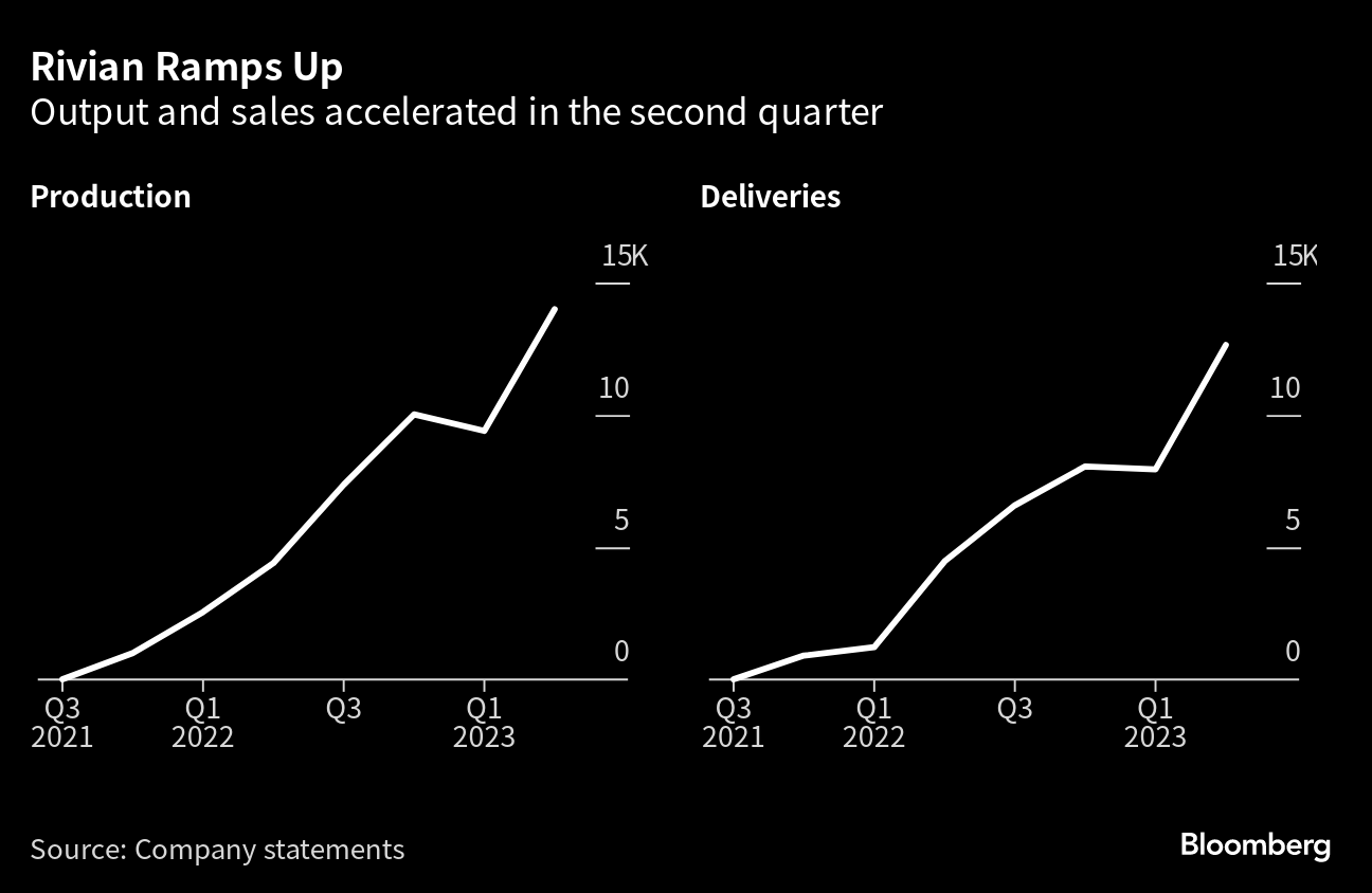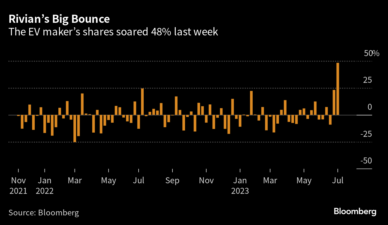 The maker of plug-in pickups, SUVs and delivery vans is coming off its best week since its November 2021 debut — the shares soared 48% after the company reported better quarterly production than expected and started shipping hundreds of vehicles to Europe for Amazon.com Inc., its biggest shareholder.