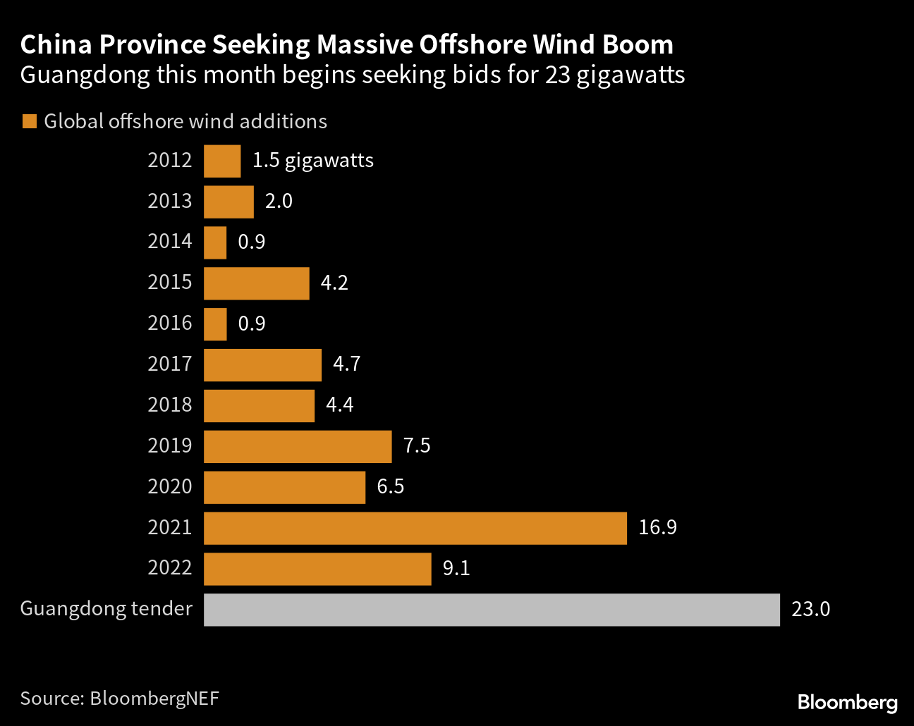 (Bloomberg) -- China’s Guangdong province will accept bids this month to construct 23 gigawatts of offshore wind power as one of the nation’s economic engines seeks to stave off energy shortages.