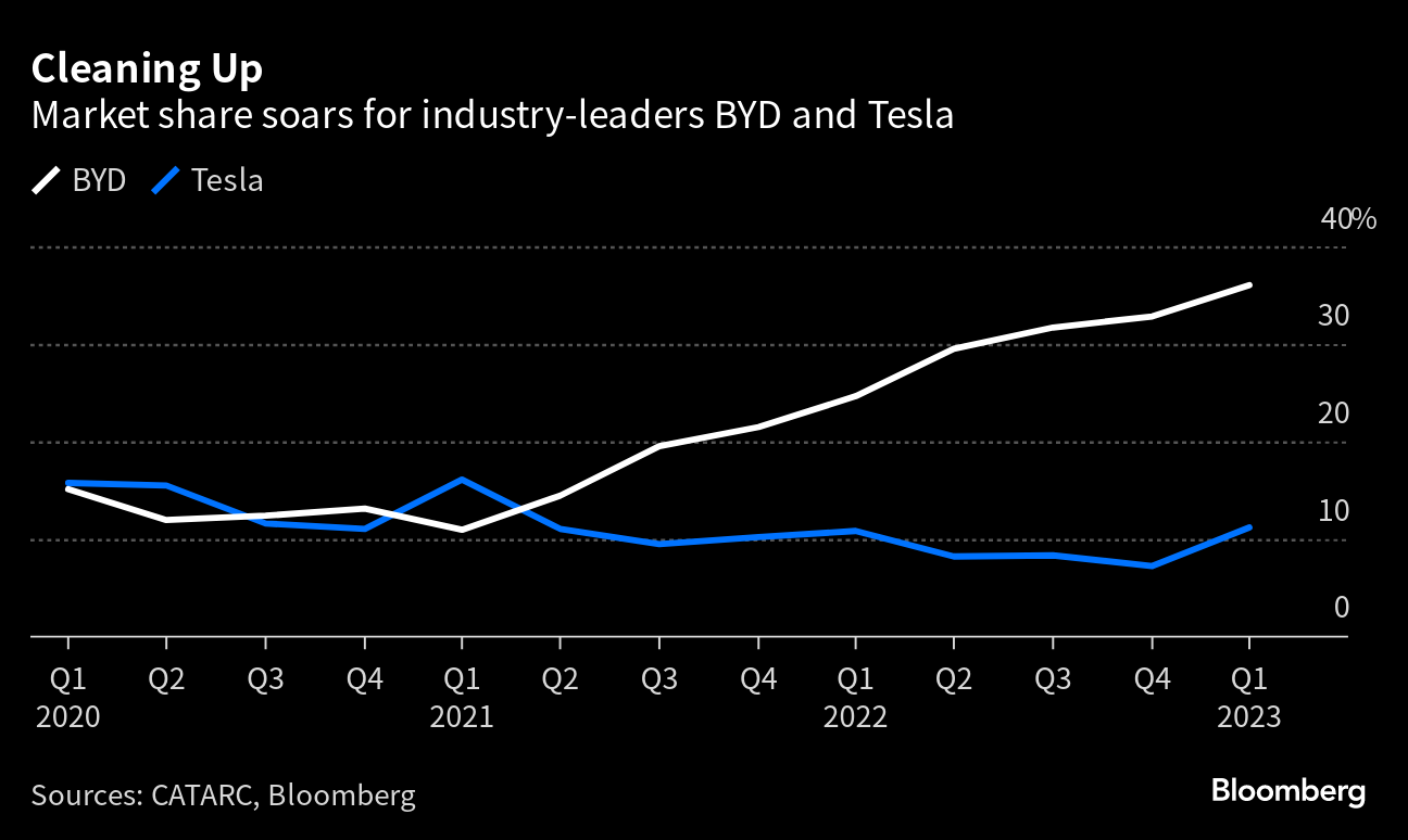 The cutthroat market formally transitioned from over-crowed to moderately concentrated in the first quarter, based on the Herfindahl-Hirschman Index, a metric used by academics and regulators to evaluate competition and measure market concentration. The biggest winners are players already at the top, like BYD Co. and Tesla Inc., which have been consolidating their power.