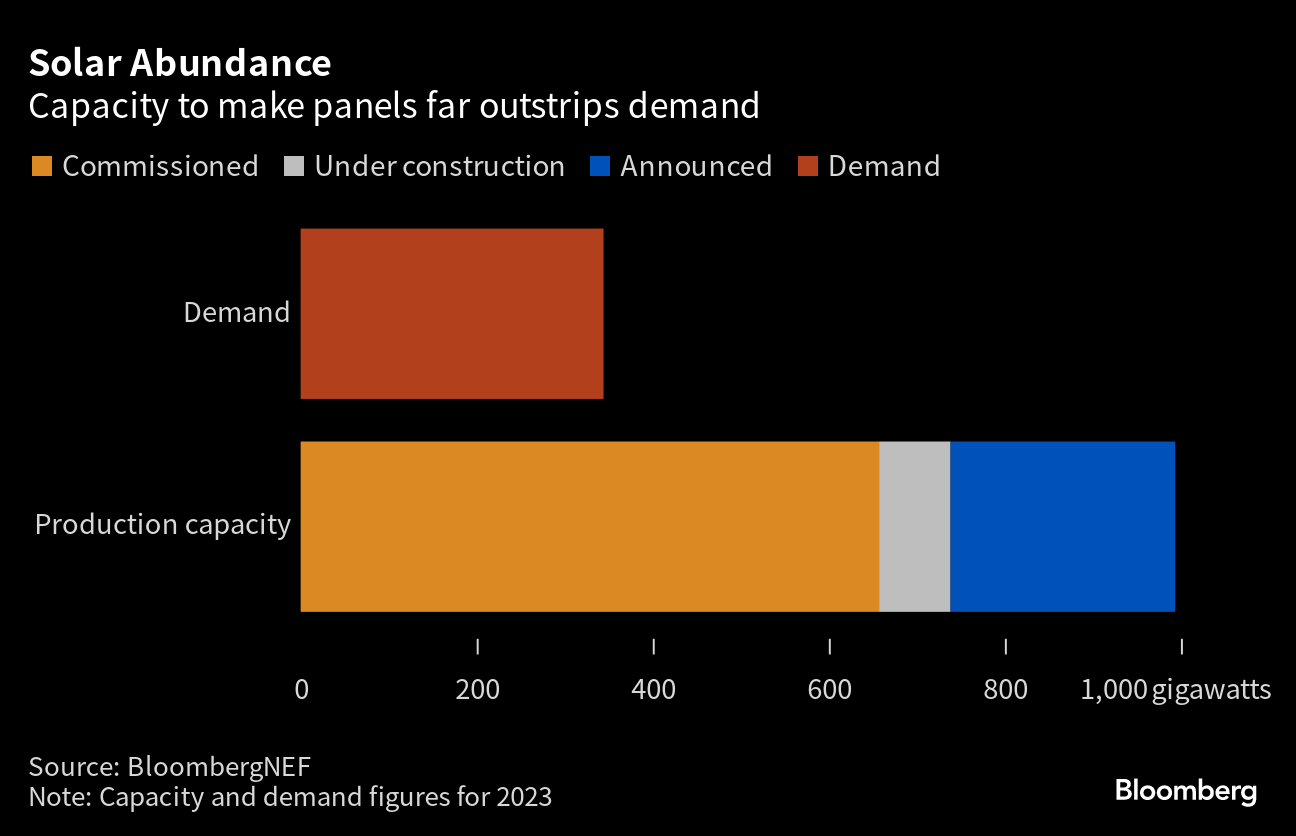 Manufacturers are boosting their capacity to produce solar equipment across the value chain. There are enough factories right now to produce 657 gigawatts of solar modules a year, with another 336 gigawatts announced or under construction, according to BNEF data. Total installations this year are expected to rise to 344 gigawatts.